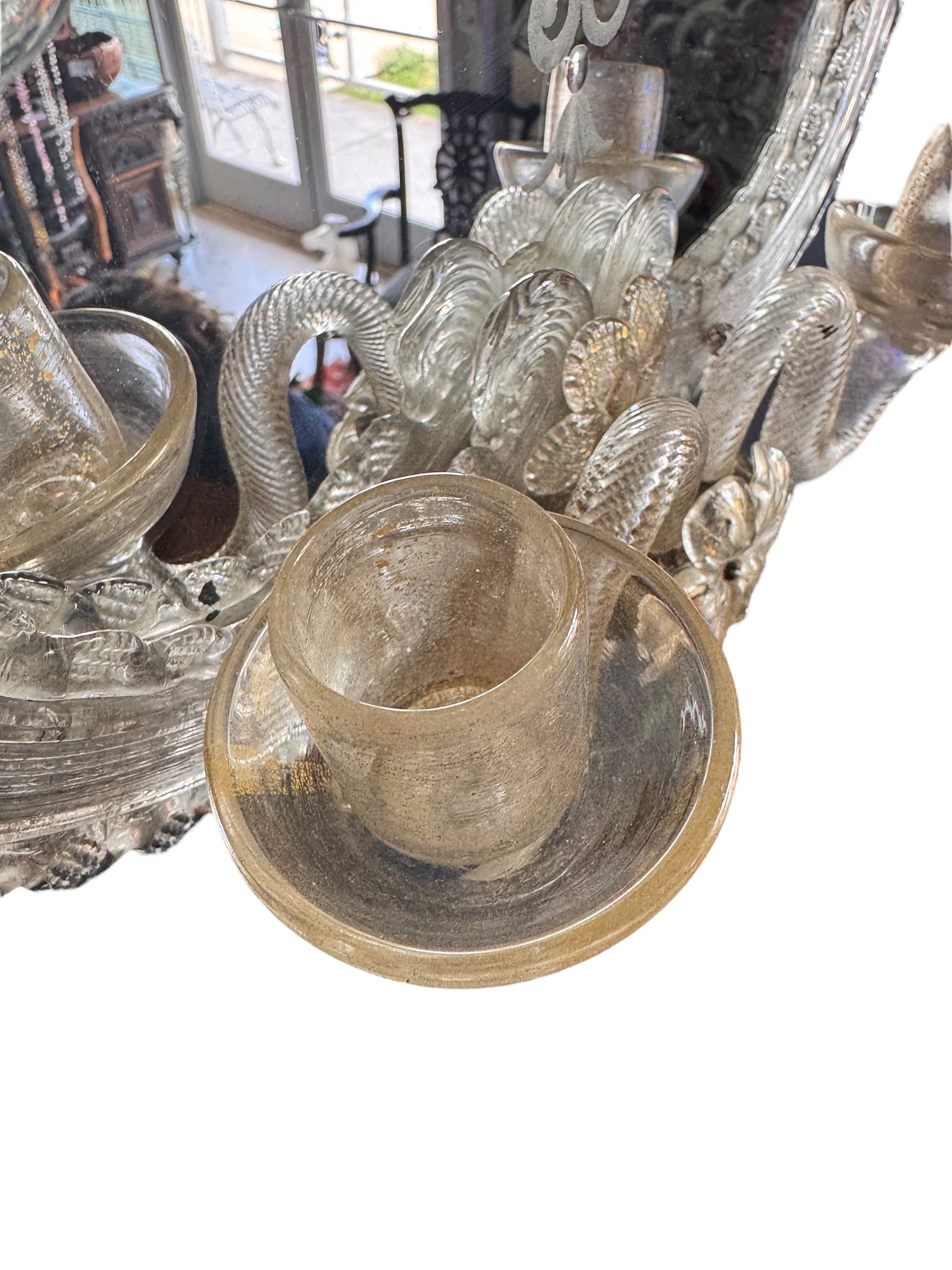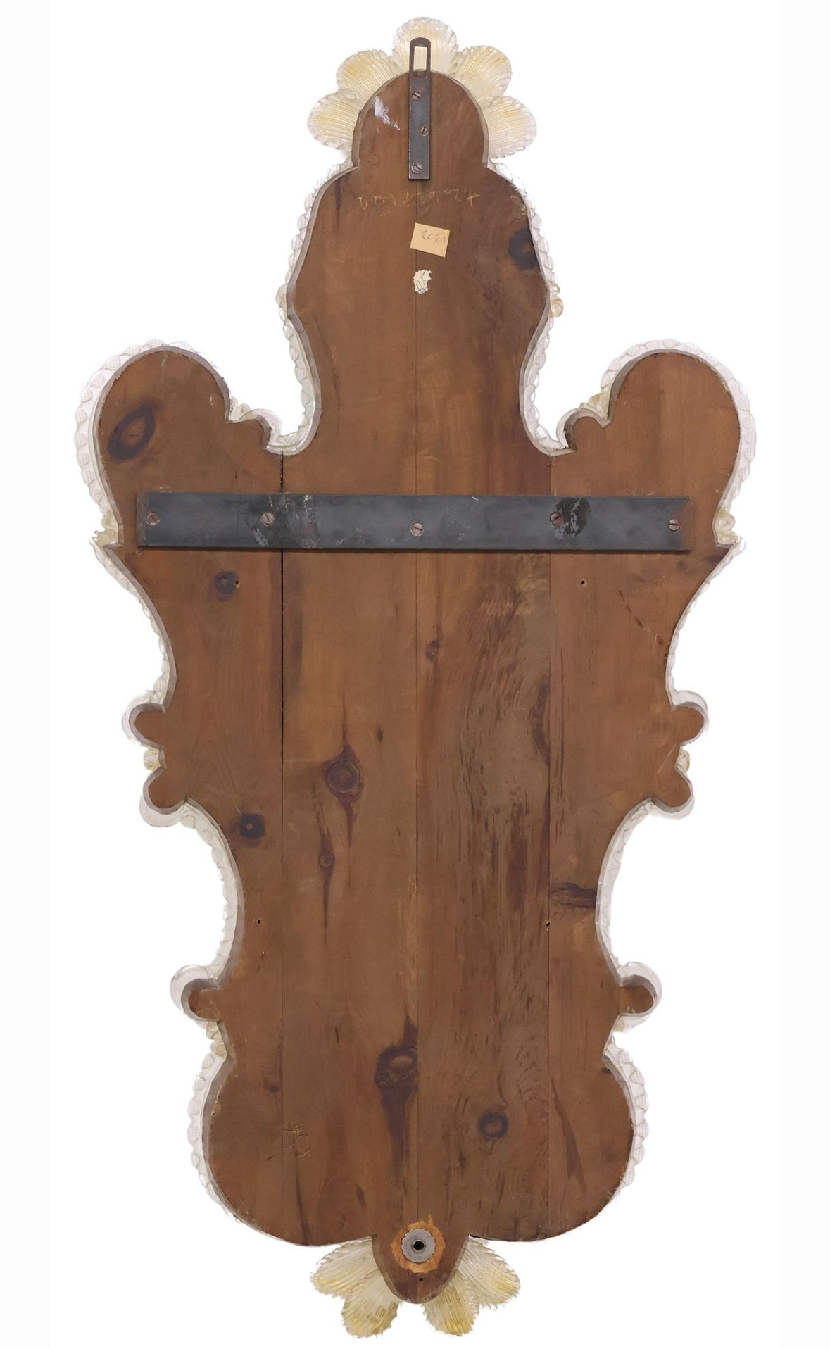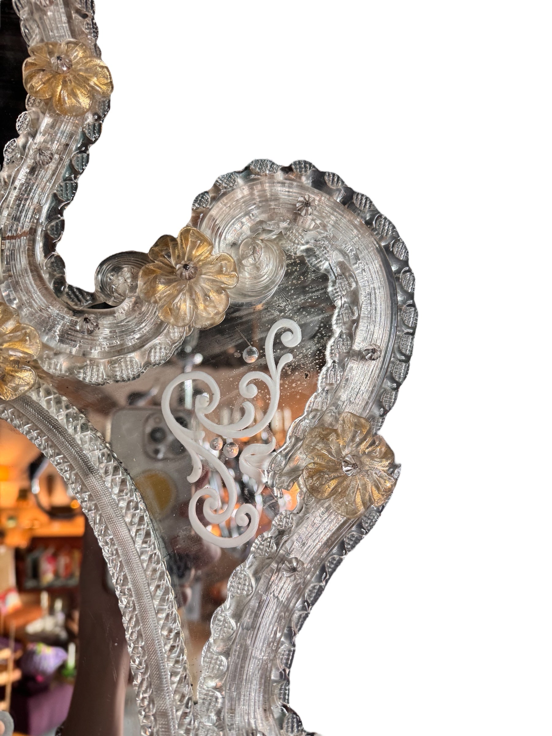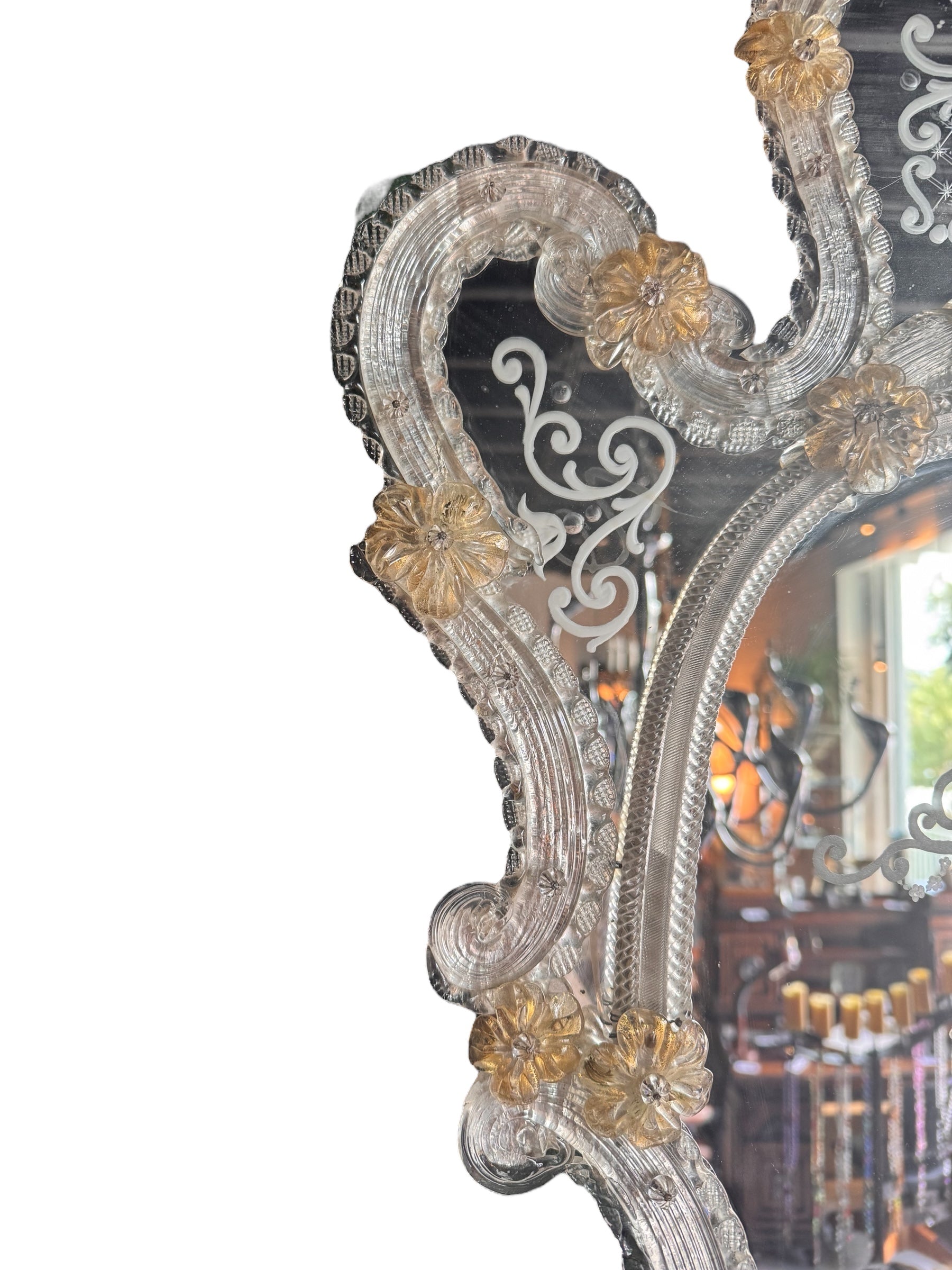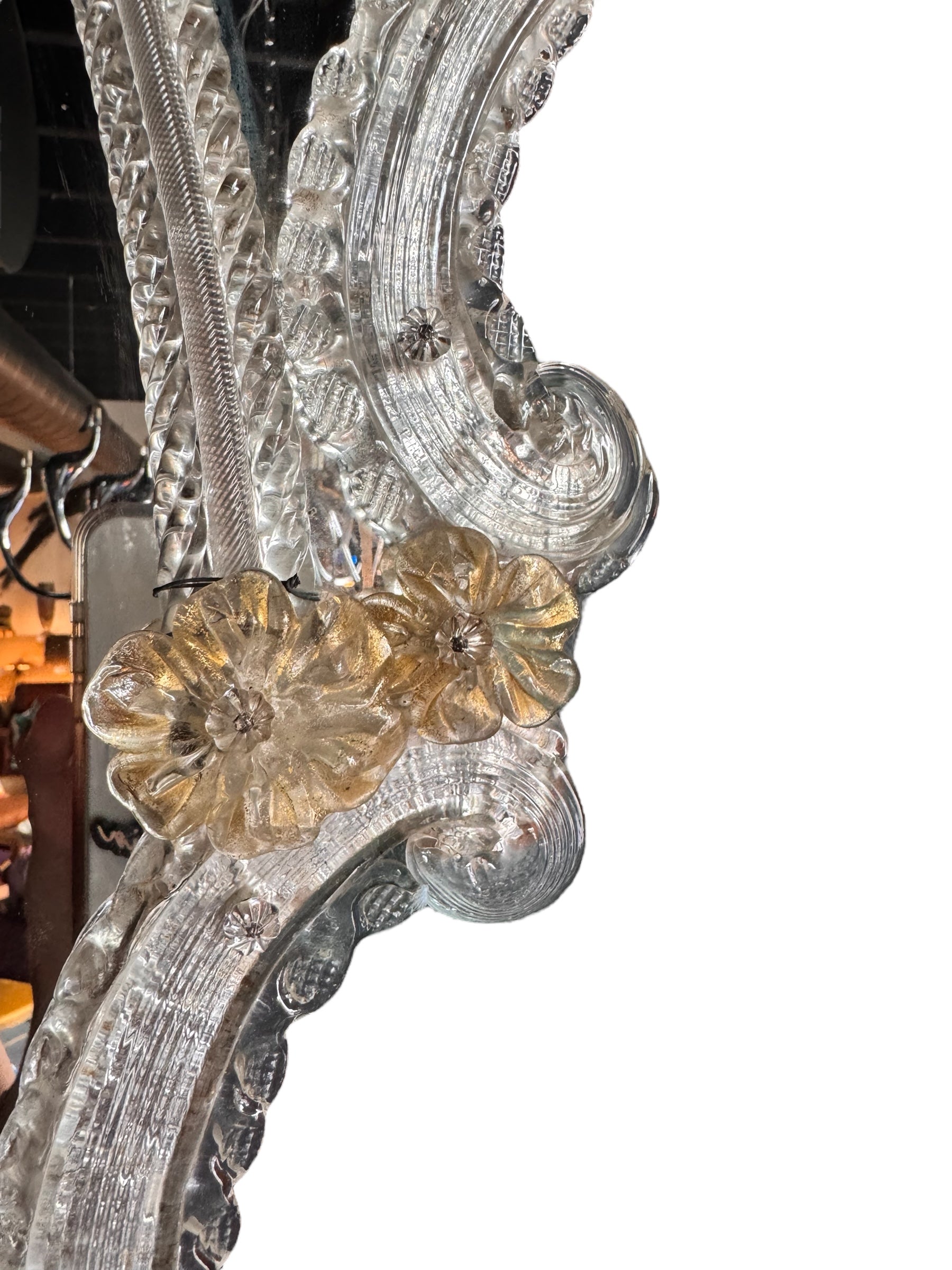 Elevate your interiors with this rare and highly desirable Italian Venetian art glass girandole parclose mirror. A masterpiece of Murano craftsmanship. The magnificent fanned floral crest cascades into a shapely frame, lavishly embellished with scrolled Murano glass cladding. This exquisite detail hints at the time-honored Venetian tradition of vetro soffiato – glassblowing – where molten glass is skillfully shaped by breath and hand, resulting in organic forms and unparalleled artistry.