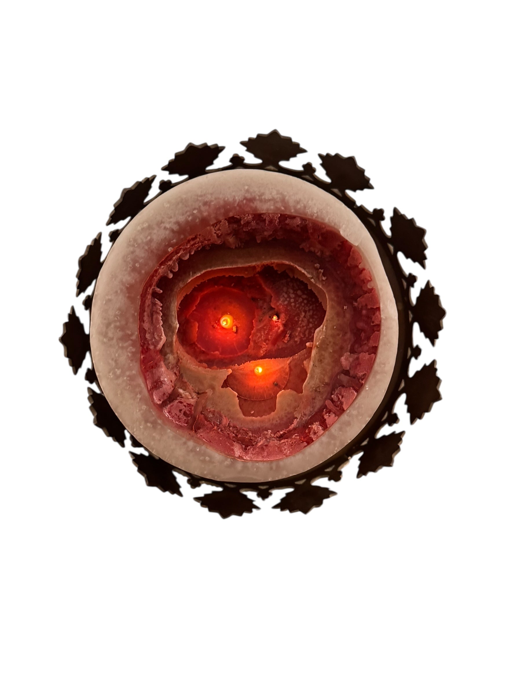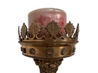Crafted from heavy-gauge cast and turned brass, the surface retains a rich, historical character. It exhibits an authentic, time-worn patina with visible spotting and oxidation consistent with age and use. Notably, the crown gallery displays a vertical seam in the band—a natural separation of the original construction join common in antique metalwork. The entire structure rests upon a substantial, weighted circular base, adorned with applied geometric bosses that mimic the decorative ironwork of medieval church doors, ensuring stability and visual grounding.