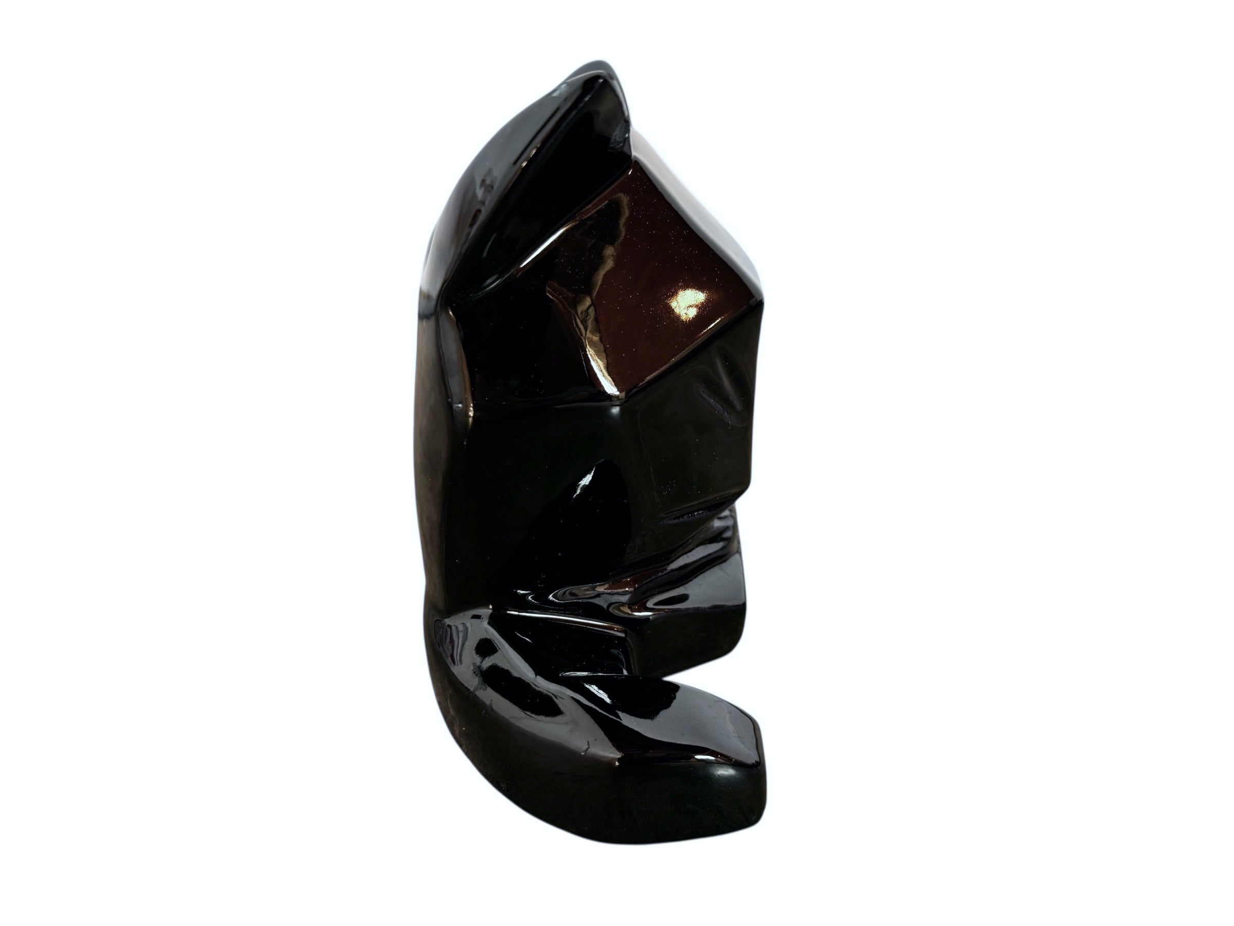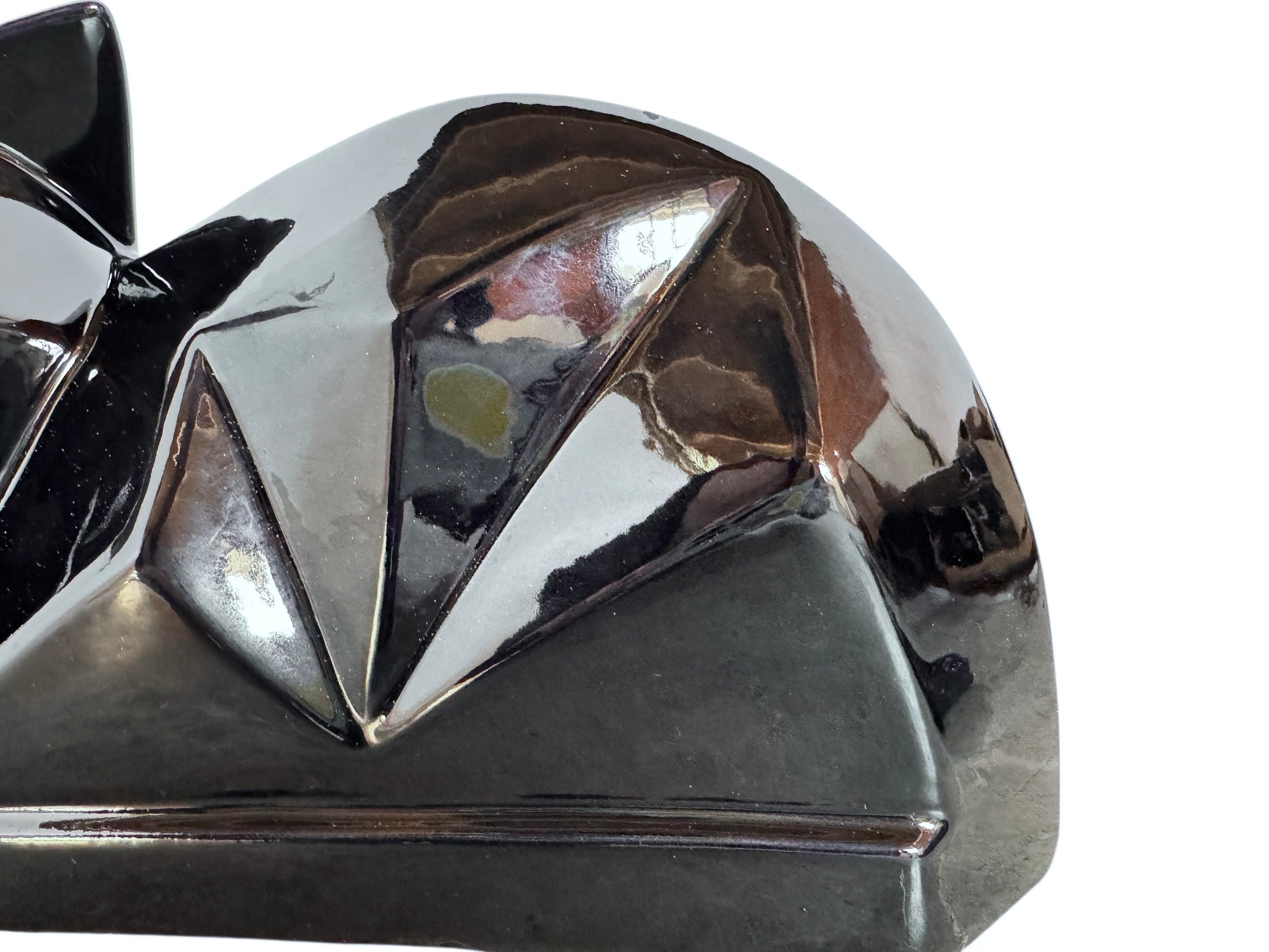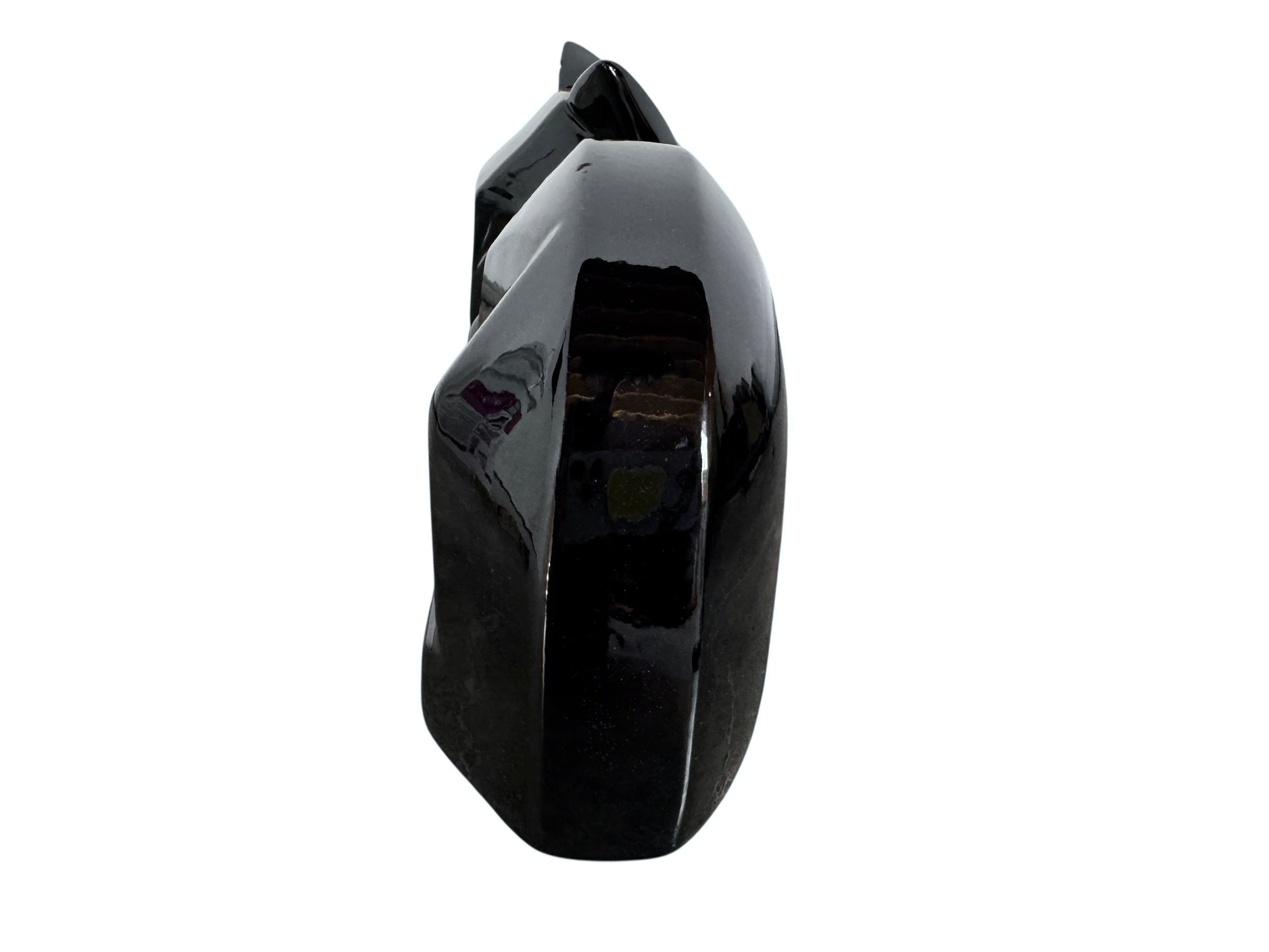 A definitive example of American decorative modernism, this sleek feline sculpture is a signed piece from the Vanguard Accents collection. The design is characterized by its bold, faceted architecture—replacing organic curves with sharp, angular planes that catch the light dramatically against the deep black glaze.