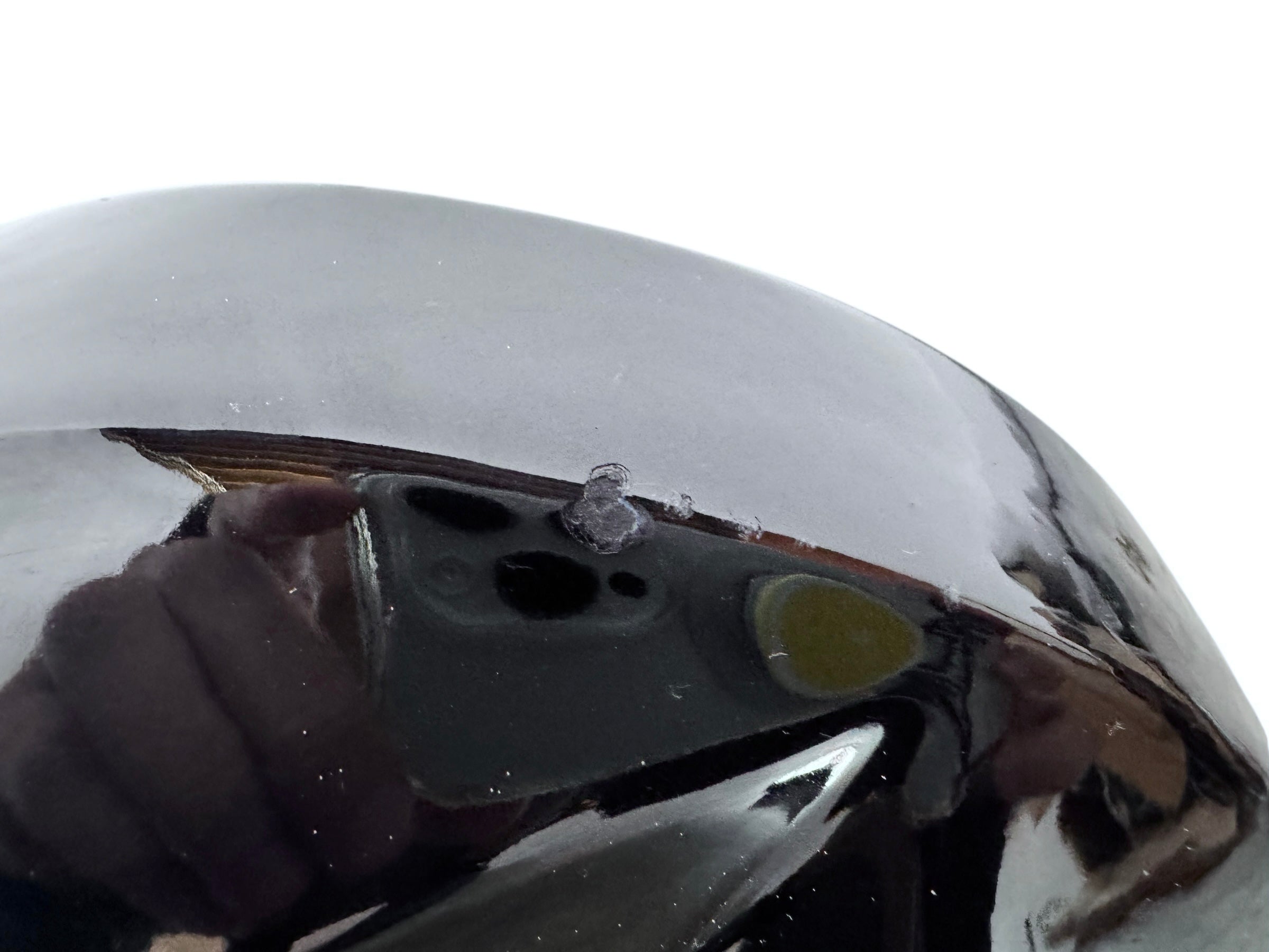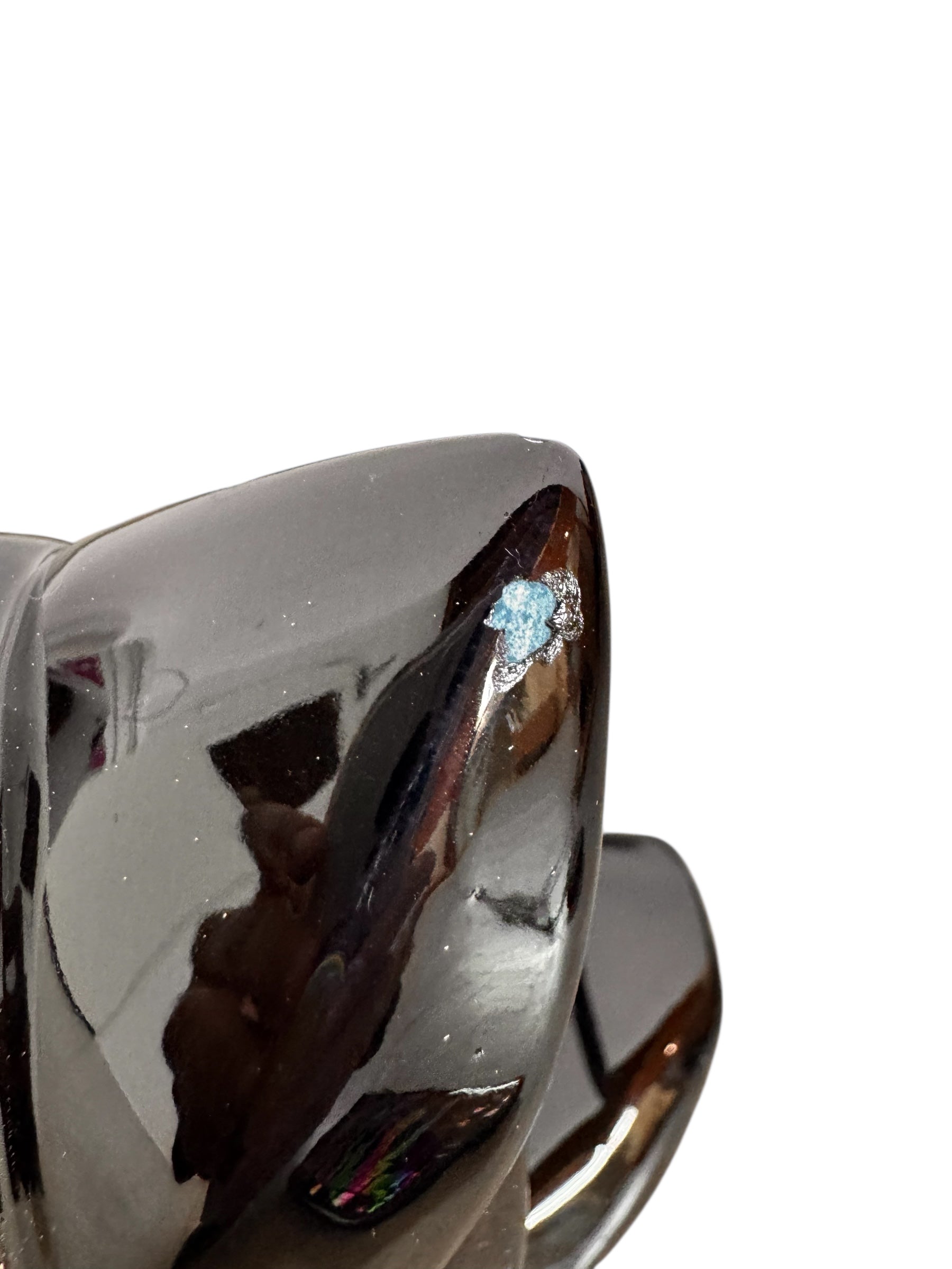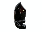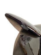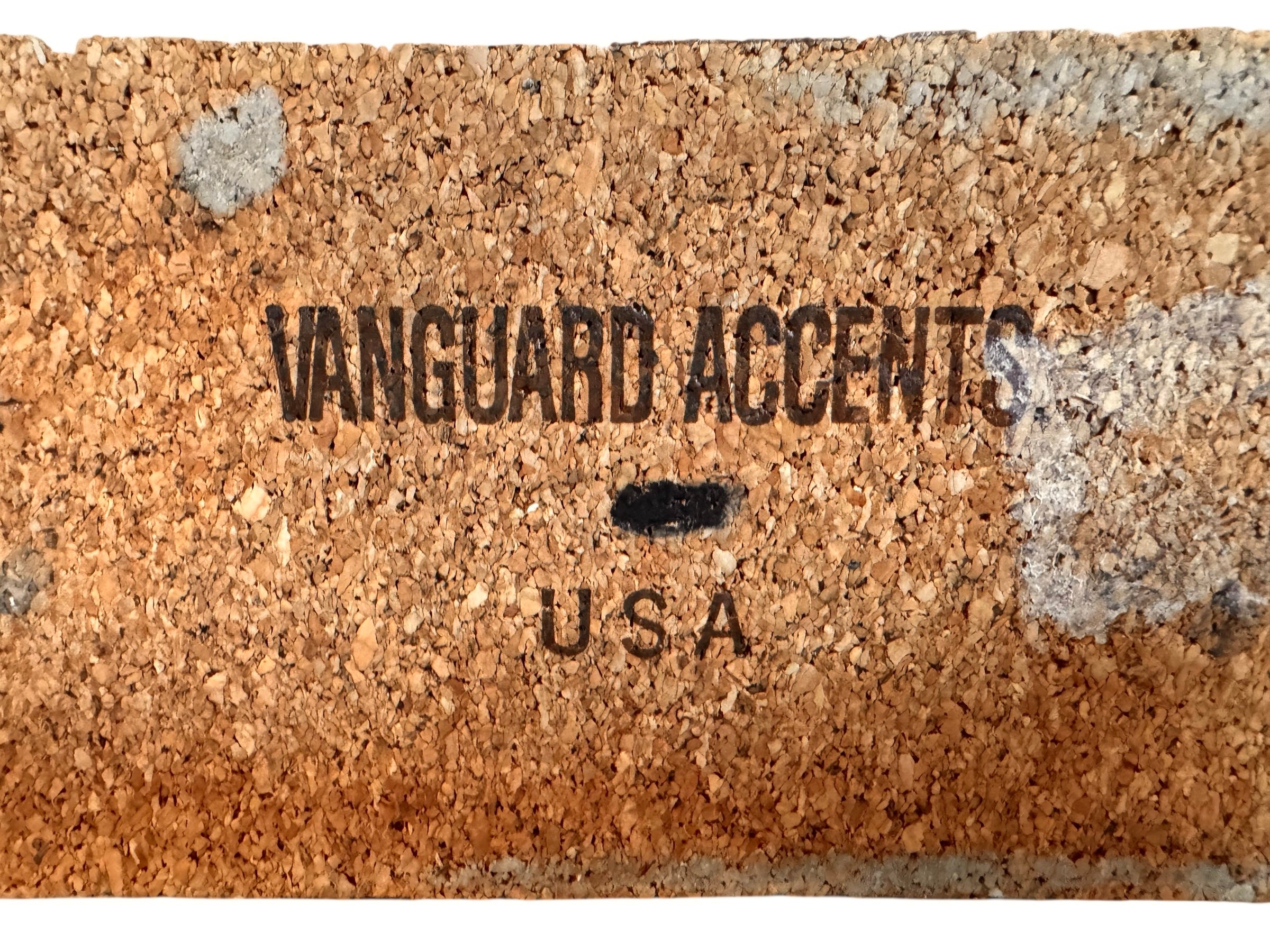 The piece retains its original cork base, clearly stamped "VANGUARD ACCENTS USA," ensuring its authenticity. While the sculpture displays minor chipping to the ear tips consistent with its vintage journey, its striking silhouette and glossy obsidian finish remain a powerful visual anchor for any Mid-Century or Post-Modern interior.