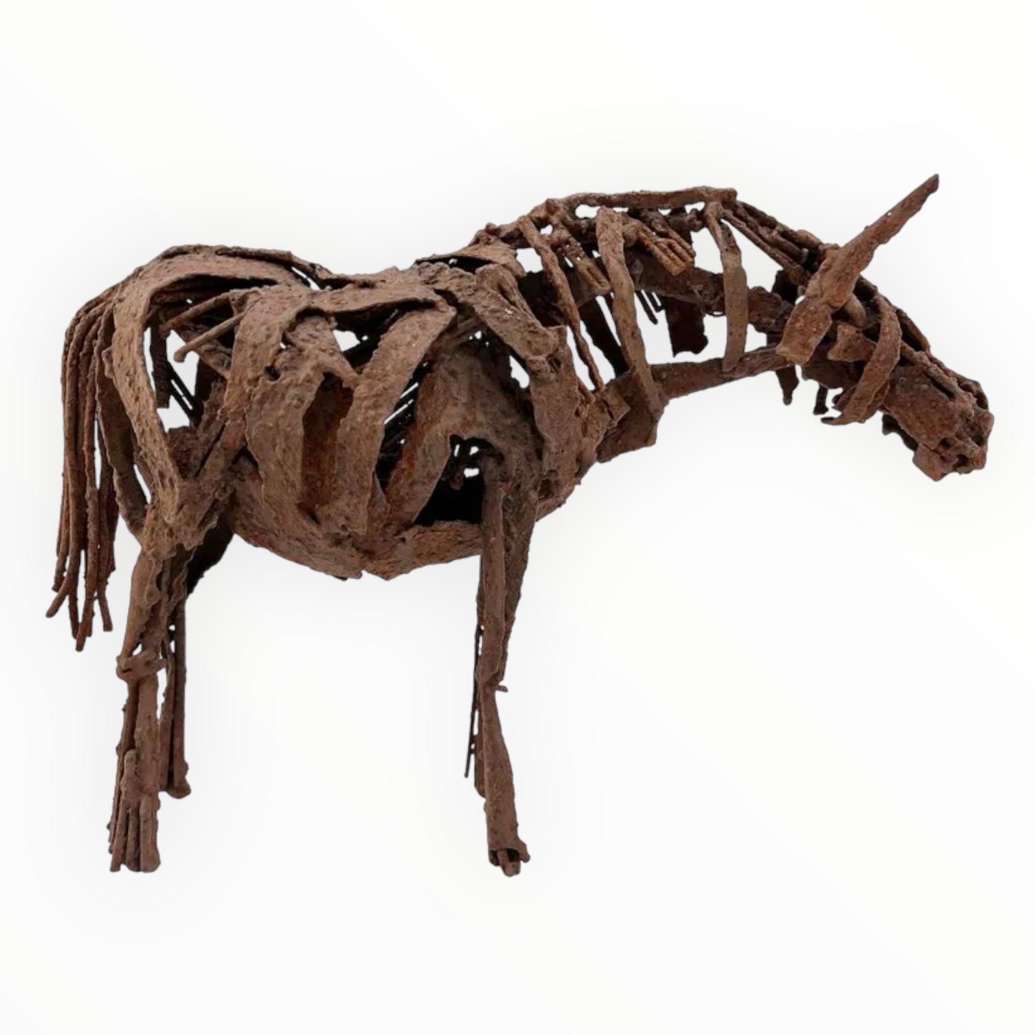 Abbiamo un debole per l'Equus Caballus a ByCloudia e questa scultura di cavallo in piedi di Nina Scott Hansen non delude. È un pezzo fluido nonostante il suo aspetto brutalista. La posizione e lo sguardo realistici della scultura sono ipnotizzanti. Una scultura tridimensionale. Arte originale. Acciaio saldato a taglio vivo. Patina corrosa. In bellissime condizioni.