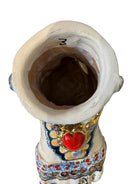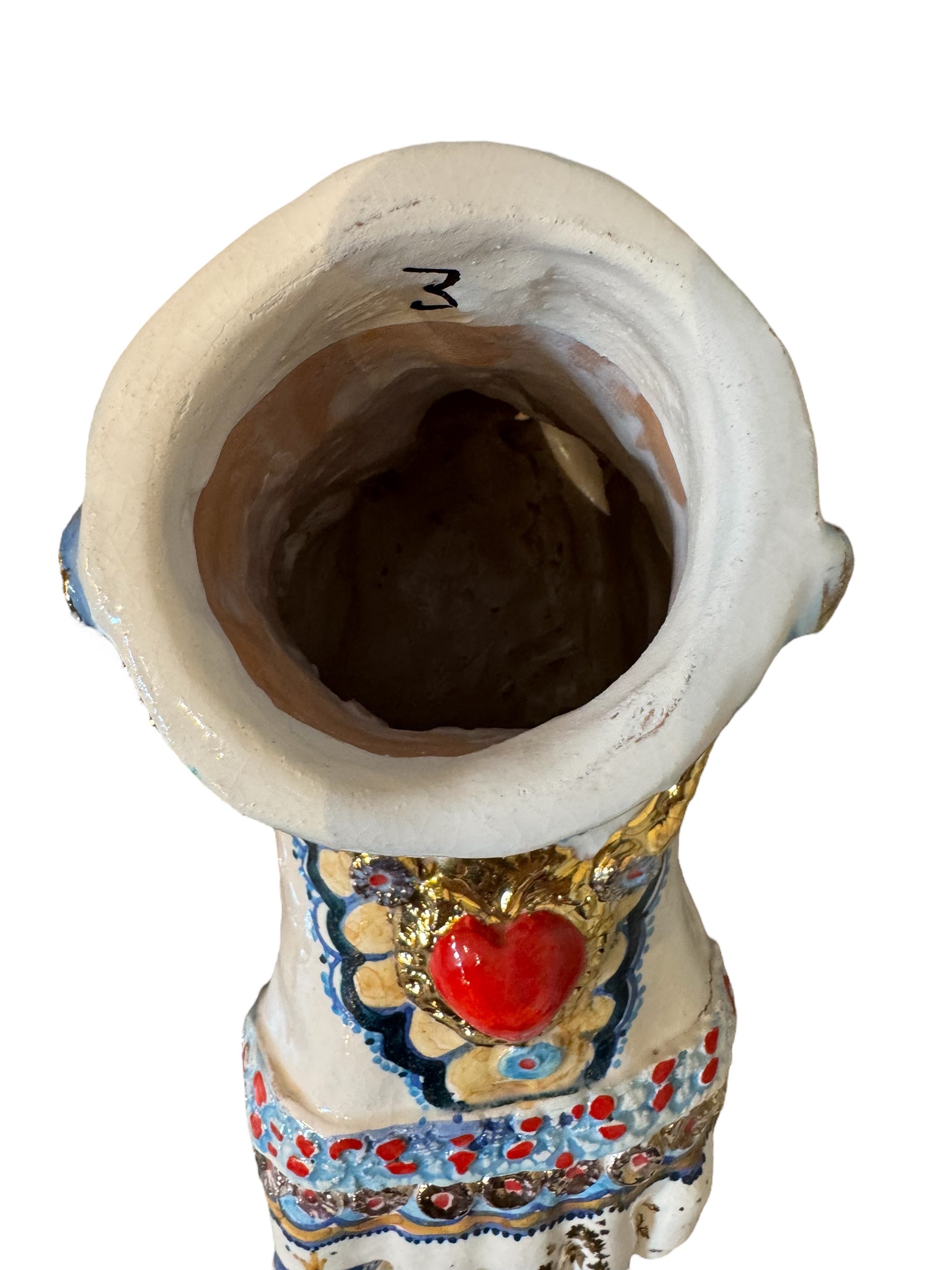 Domenico Pinto's ceramic foot presents a compelling intersection of the sacred and the corporeal. Skillfully hand-formed in his Grottaglie studio, the sculpture transforms a familiar form into a vessel of layered meaning. Pinto's signature meticulousness is evident in the hand-painted details, drawing upon the rich visual language of Apulian folklore and tradition. The delicate, yet striking palette is further elevated by the application of shimmering 24KT gold accents, lending an aura of preciousness and reverence.