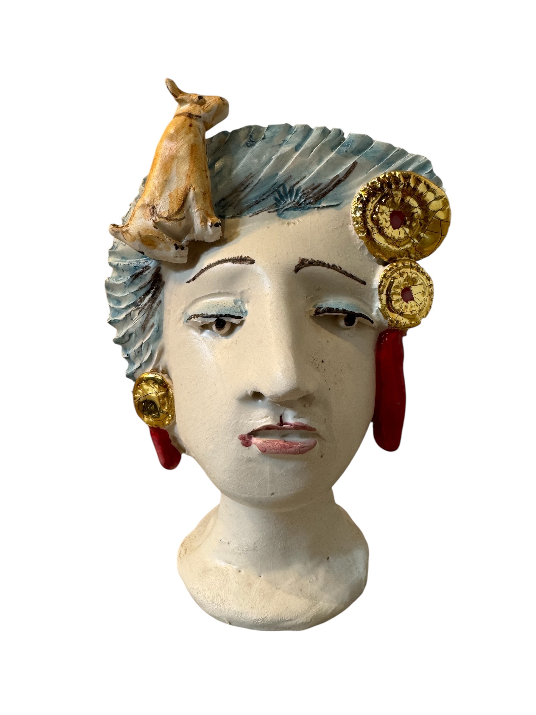 Domenico Pinto, "Il Professore" of Grottaglie, presents a playful yet elegant exploration of loyalty and beauty in this striking ceramic sculpture. The female form embodies Pinto’s signature style, seamlessly blending traditional ceramic artistry with a contemporary sensibility. Pinto masterfully combines whimsy and sophistication. Adorning the sculpture's head is a charming dog, positioned as a loyal companion. The dog, detailed with delicate hand-painted markings, adds a touch of rustic charm. The red jeweled earrings add color to this piece, while touches of 24kt gold accent the decorative elements.