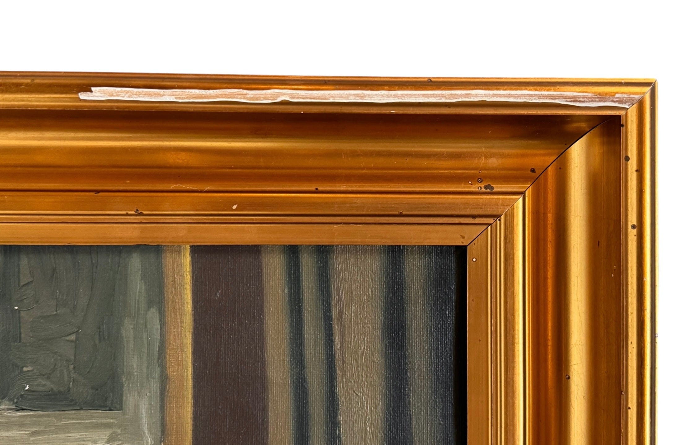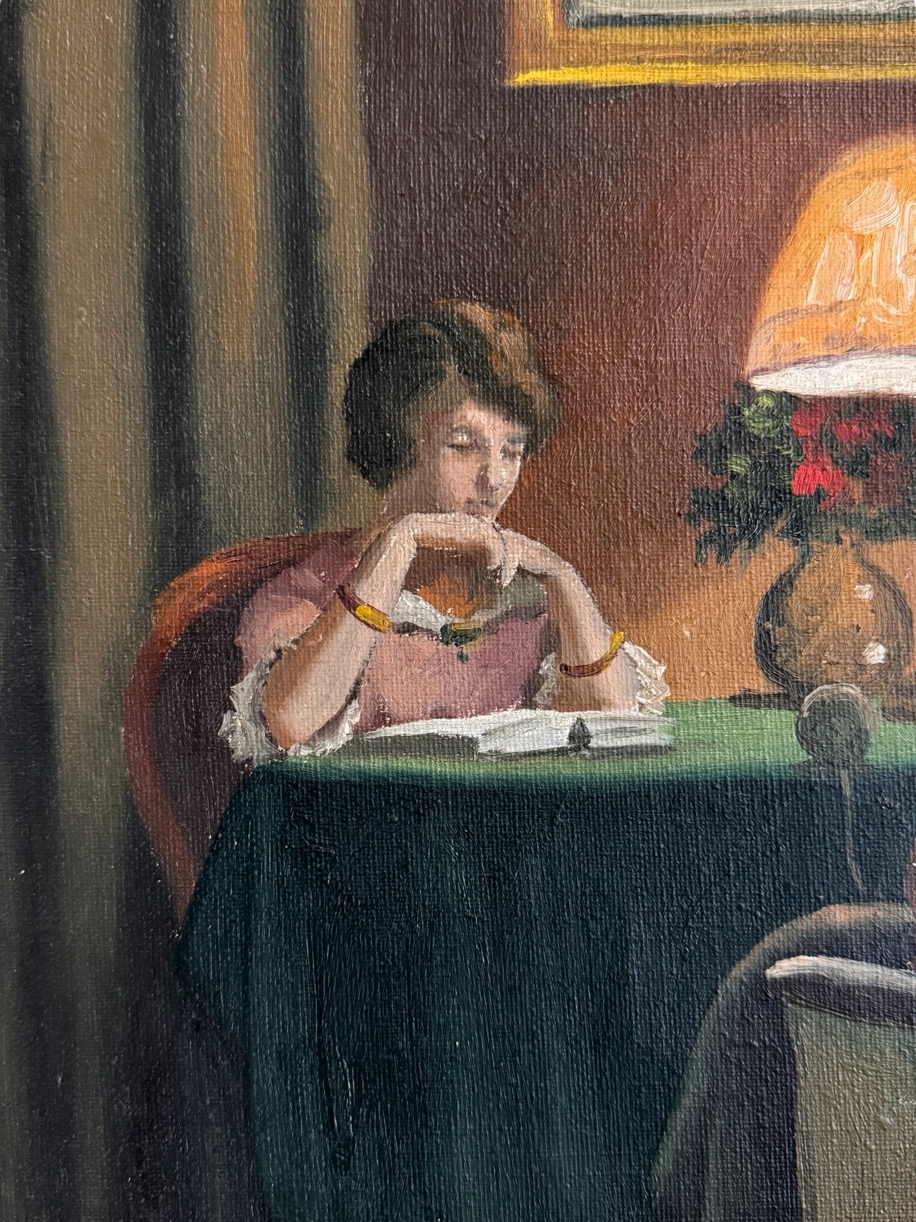 An evocative oil on canvas by the noted Danish artist Aage Jessen. This painting presents an intimate interior setting with two women engaged in quiet pursuits: knitting and reading. The composition is a testament to Jessen's skill in rendering light, with the lamp serving as a focal point, illuminating the scene and creating a sense of warmth and tranquility. Jessen's paintings often focused on scenes of everyday life, and this work is a fine example of his style. Signed "Aage Jessen" lower right. Some distress to top right of frame. Painting in great vintage condition.