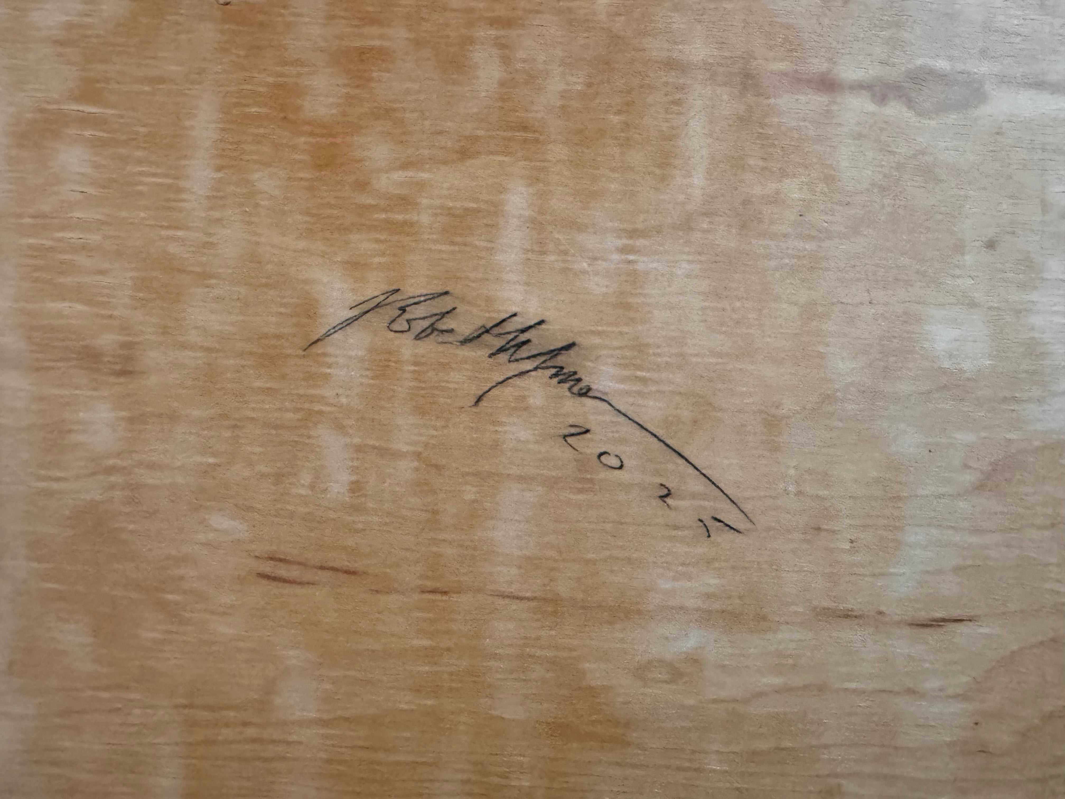 The artist's rigorous preparation—employing rabbit skin glue gesso, a nod to Old Master practices—ensures a luminous and enduring quality. Influenced by his grandfather's studies of color and technique, Wymer's painting embodies a tension between the decorative and the profound. The incised lines add a tactile dimension, enhancing the sense of depth and structure within the seemingly abstract pattern.
