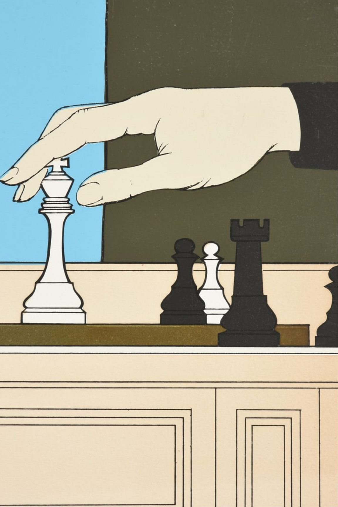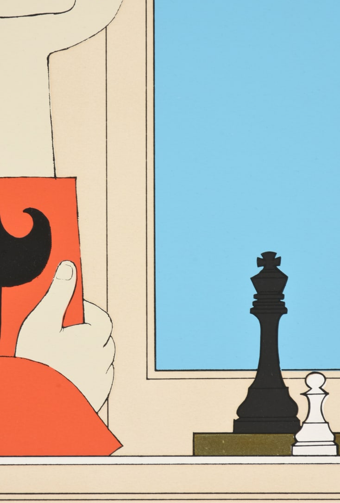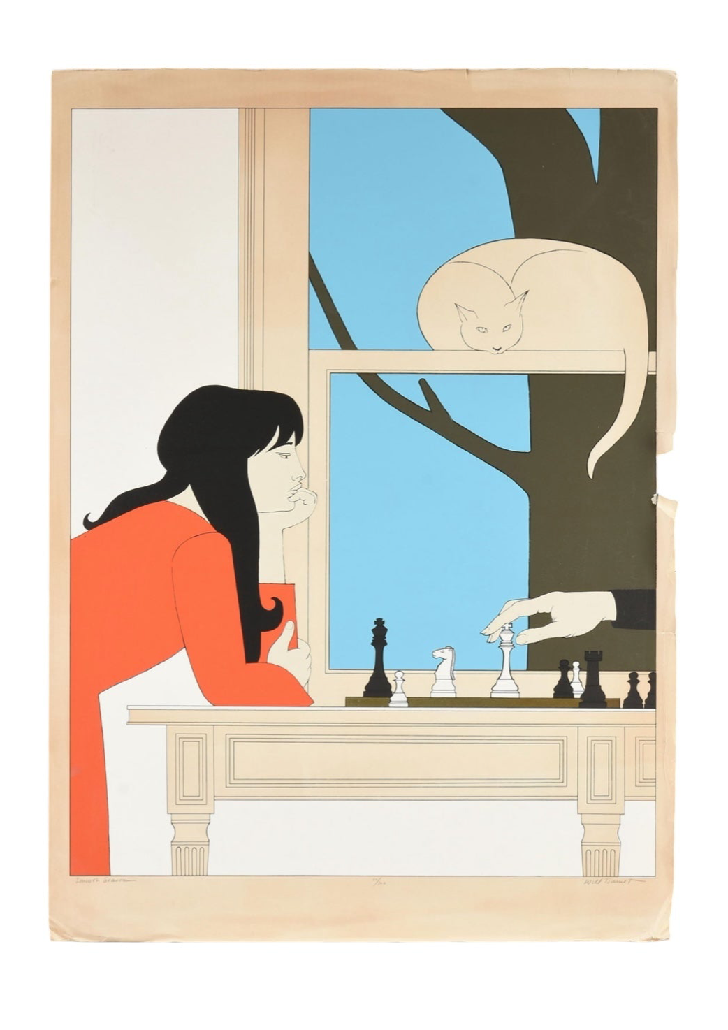 "Seventh Season," a 1975 serigraph by Will Barnet, depicts a stylized scene of a woman, likely his daughter, playing chess with an unseen figure (possibly the artist himself). The composition features color-blocked figures in a muted interior, with a dark palette and monochromatic backgrounds that create a sense of mystery and foreboding. A cat is perched on the window sill, adding another layer of visual interest and symbolism.