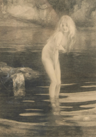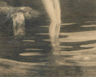 After Paul Emile Chabas (French, 1869-1937), "Baigneuse Au Crepuscule (Twilight)," Photogravure, 1905. This captivating photogravure, "Baigneuse Au Crepuscule," is after the photograph "Twilight" by renowned French artist Paul Emile Chabas, celebrated for his paintings of nude women in natural settings. The print, signed and dated 1905 by the engraver ,signature illegible in image, inscribed in printed reverse in lower margin "L Dautrey d'ap. P. Chabas" with blind stamp and swallow. The print is presented in a period beribboned giltwood gesso frame, showing some signs of wear and minor loss, but remaining in overall great condition. Chabas, who trained under William-Adolphe Bouguereau and Tony Robert-Fleury, achieved international acclaim, including a gold medal at the 1900 Exposition Universelle. This photogravure exemplifies the pictorialist movement's embrace of techniques that mirrored the impressionistic qualities of painting. The photogravure process, invented in 1879 by Karel Klíč, was prized for its ability to create multiple, durable prints with rich, continuous tones and a velvety texture, achieved through a meticulous process of etching and printing from a copper plate. Examination with a magnifying glass reveals the process's telltale honeycomb pattern and the image's subtly textured surface. A beautiful example of early photographic reproduction of fine art.
