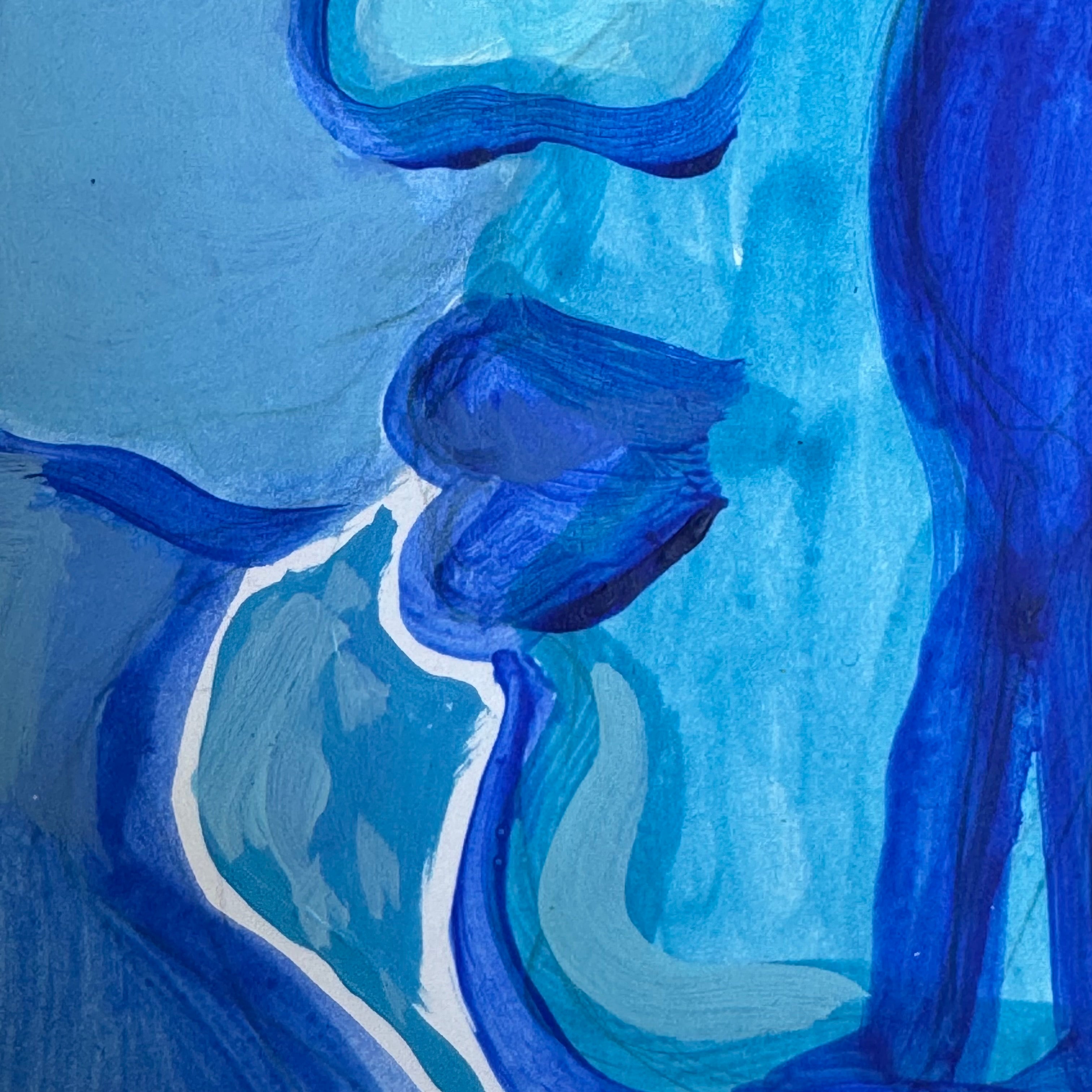 A large blue face, with an intricate design around the eyes draws attention. Surrounding figures are depicted in various shades of blue, creating a sense of depth and intrigue. The composition has a surreal quality, blending human forms and abstract elements. The use of blue tones evokes feelings of emotion and contemplation, inviting viewers to explore the connections and narratives within the piece. Overall, it conveys a powerful sense of identity and perception.