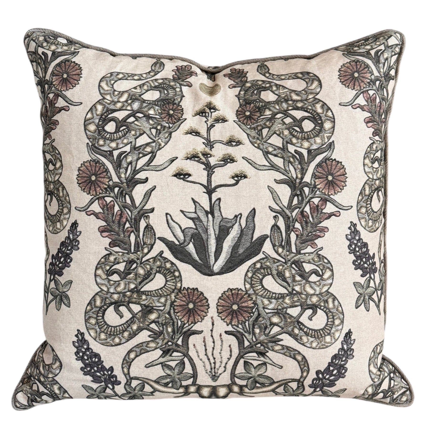 These exquisite pillows are a stunning testament to collaborative artistry, a harmonious blend of vision from Counterpart Studios and the vibrant spirit of Eloi. The designs showcase a captivating array of stylized floral motifs in a rich palette of peach, deep burgundy, teal, and olive greens, all set against a soft, neutral background. The hand-crafted, fringed border adds a touch of bohemian elegance, enhancing the pillow's overall texture and appeal.