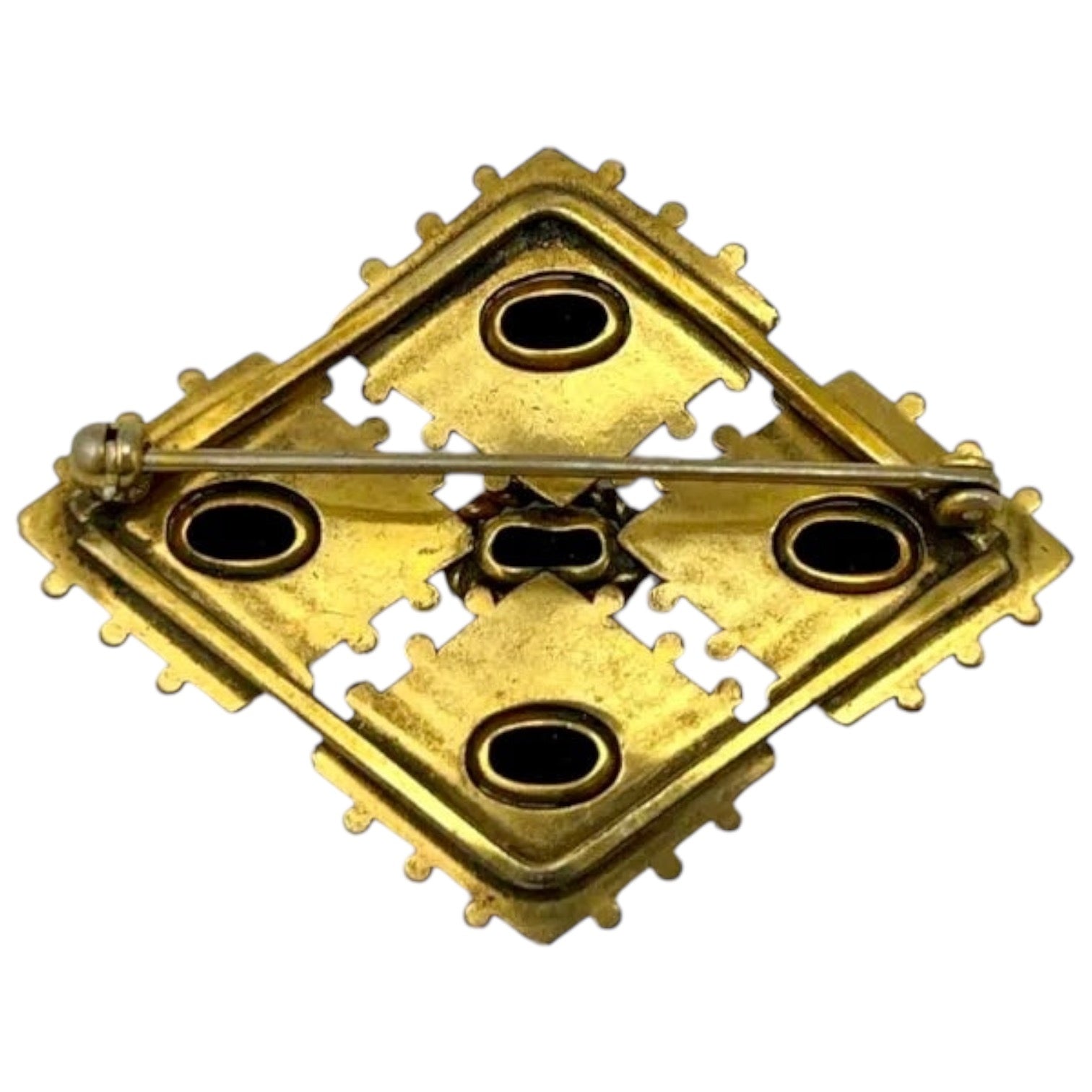 The diamond shaped brooch is crafted in 10 karat yellow gold. It is comprised of four, small diamond shapes with a fine, cross hatch finish, each centering a prong set oval almandine garnet. Each garnet is accented with loops of twisted wire. Each square is surrounded with beadwork, joining them together with one central oval almandine garnet in a four prong setting surrounded by twisted wire. The back of the brooch has a straight pin stem and locking hook clasp.