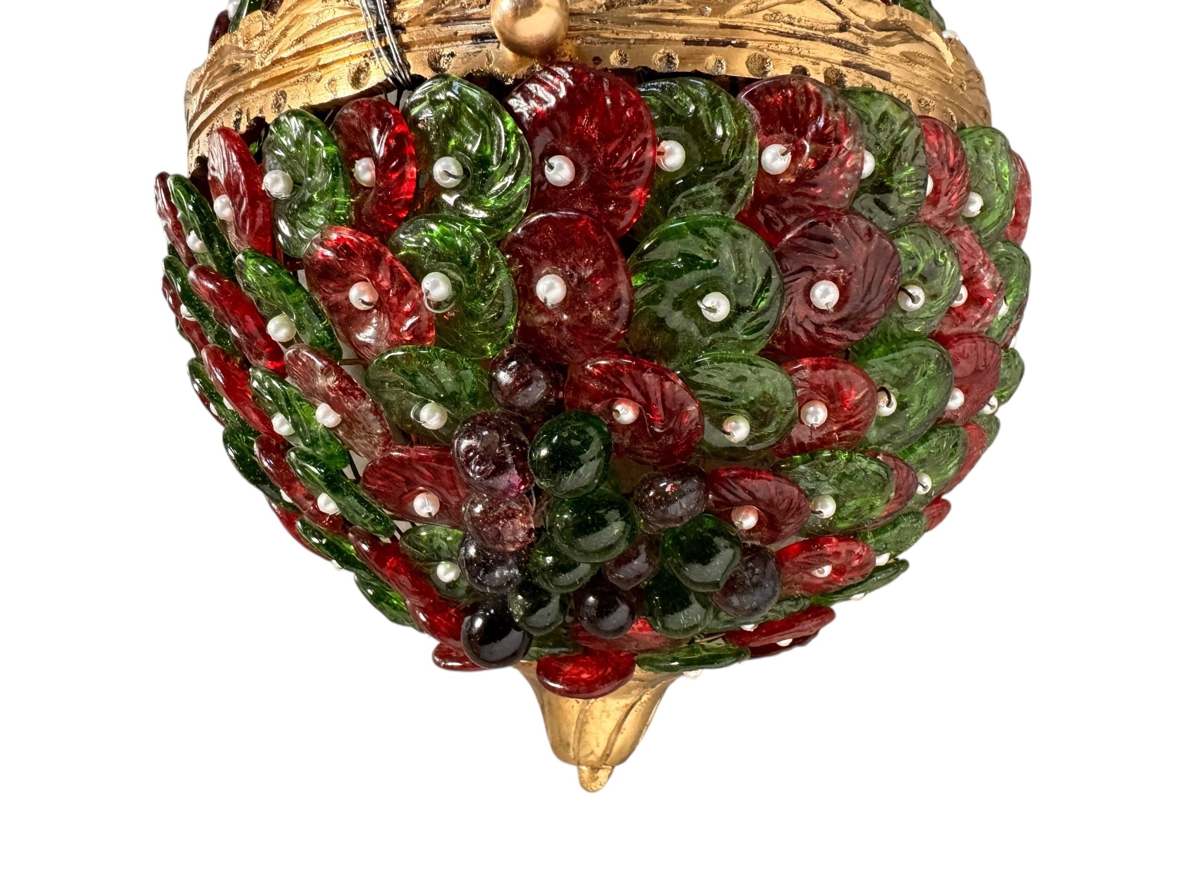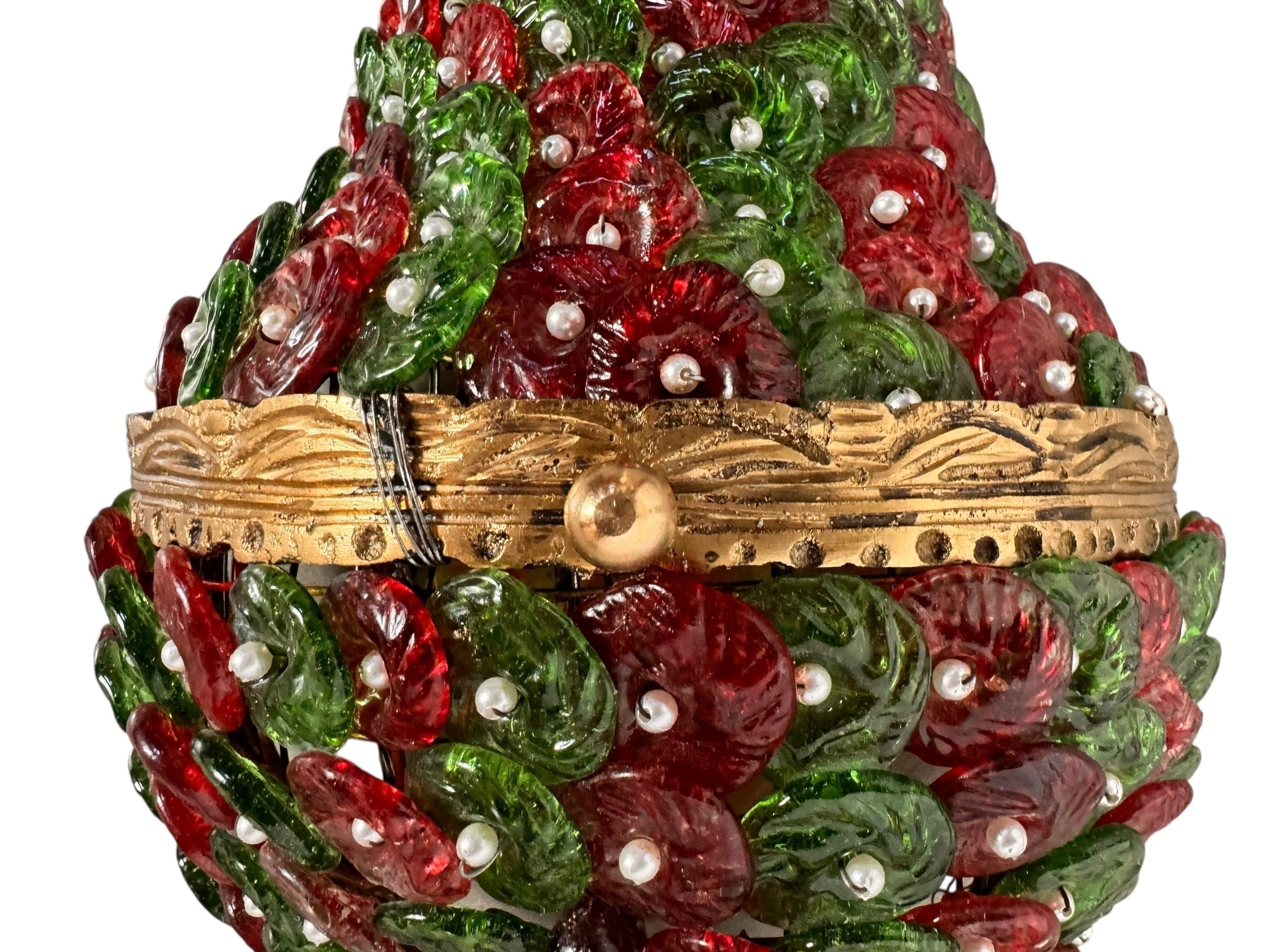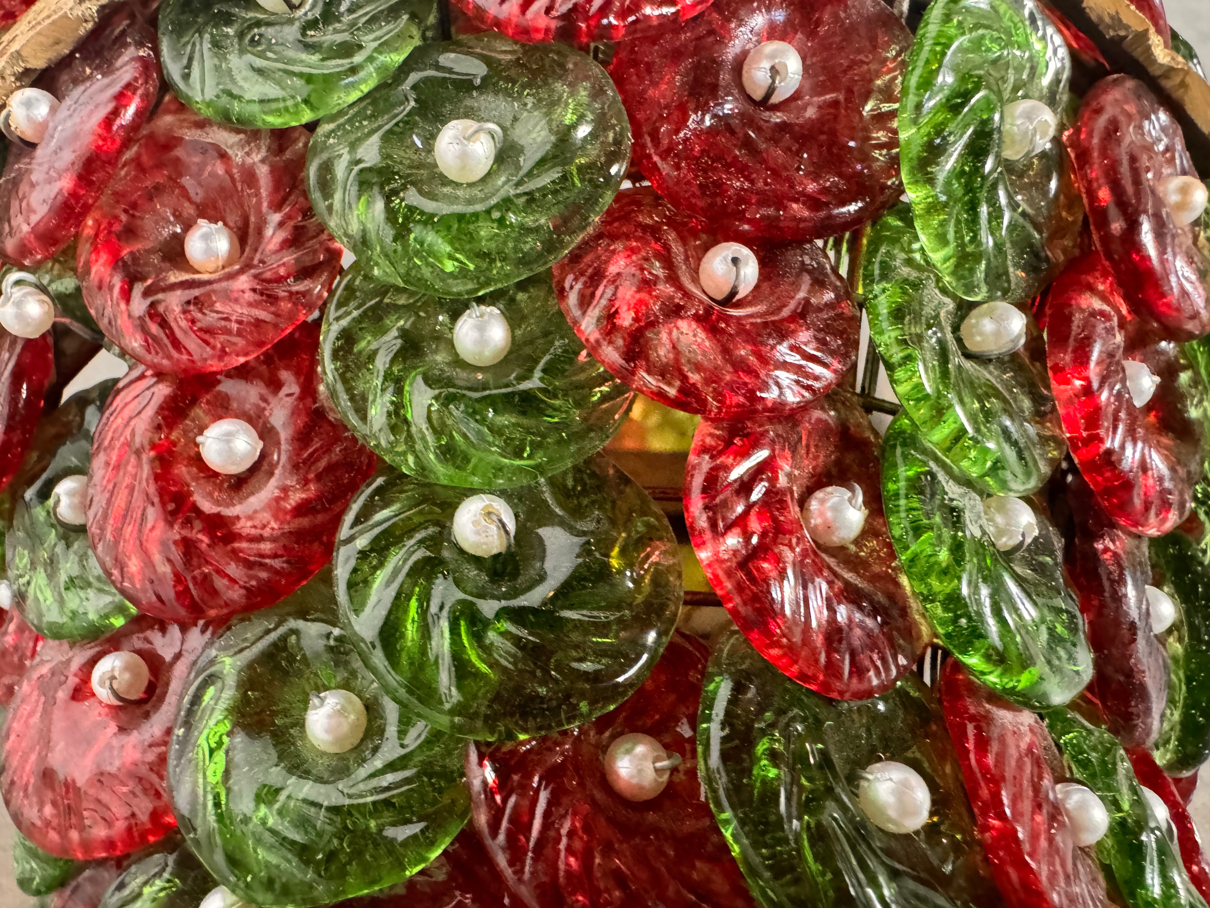 Each individual glass component, in rich hues of ruby red and deep emerald green, features unique swirling textures that play beautifully with light, creating a dynamic and enchanting glow. These captivating glass forms are artfully interspersed with smaller, spherical glass beads and delicate, pearl-like accents, adding layers of texture, depth, and a touch of opulent sparkle. The intricate arrangement evokes a sense of organic luxury, transforming light into a visual feast.