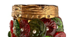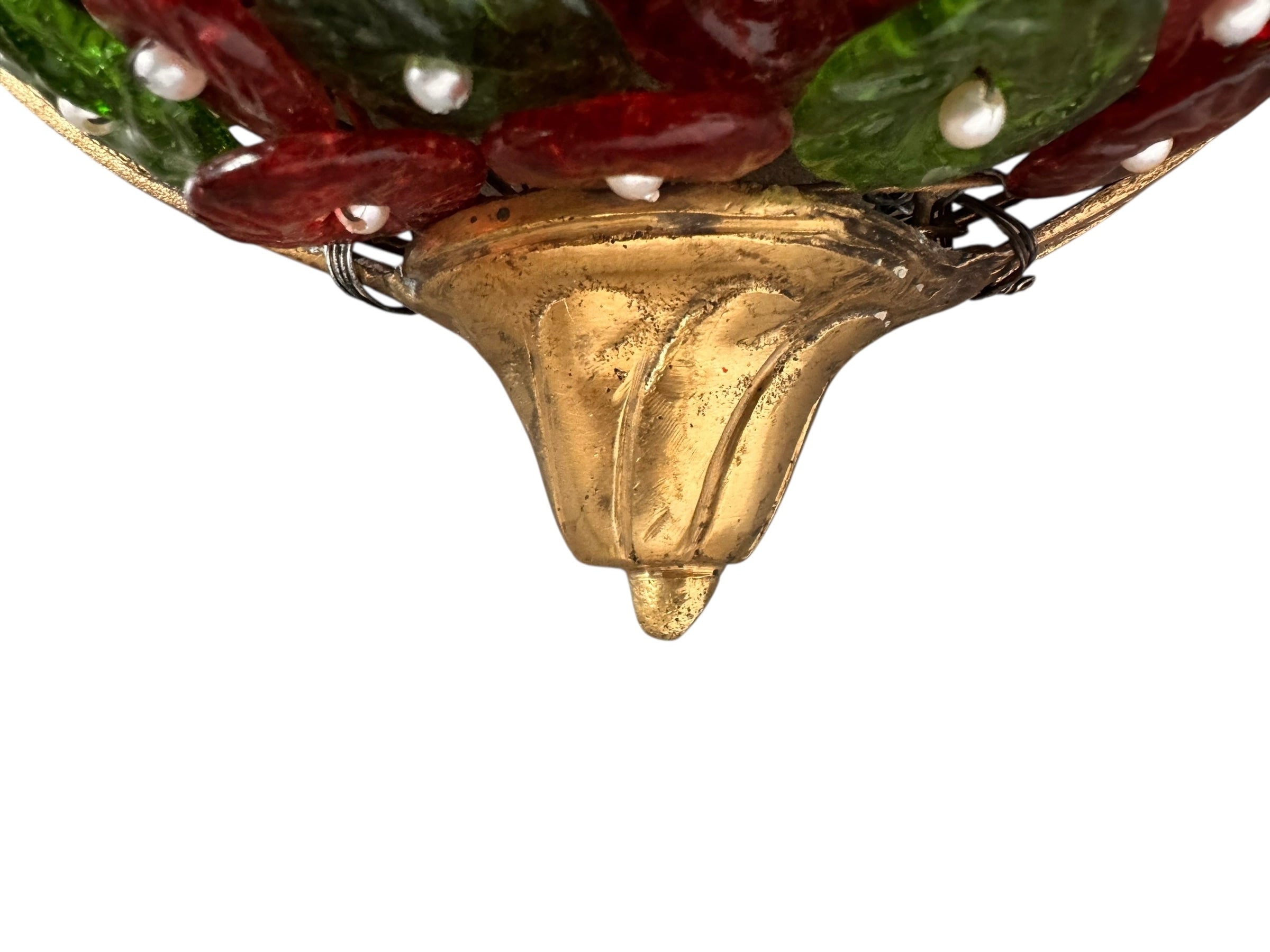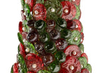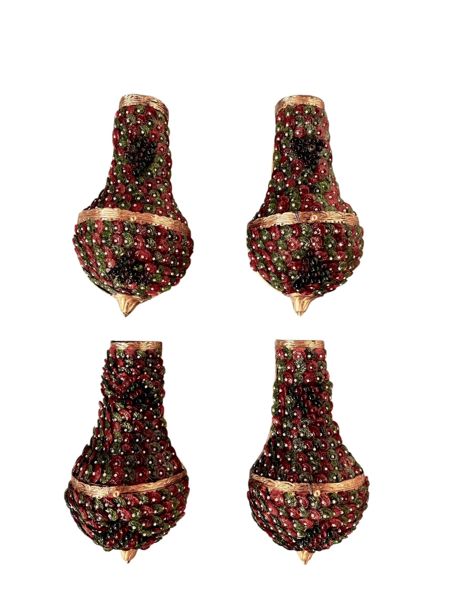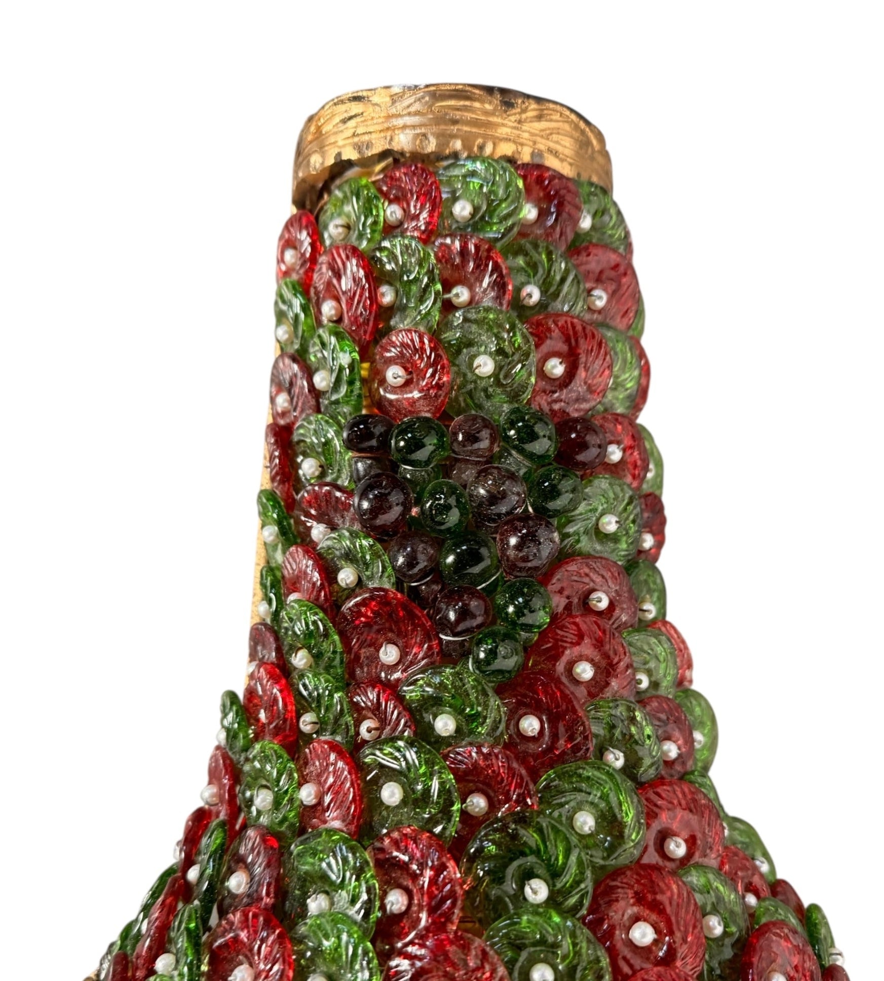 Each individual glass component, in rich hues of ruby red and deep emerald green, features unique swirling textures that play beautifully with light, creating a dynamic and enchanting glow. These captivating glass forms are artfully interspersed with smaller, spherical glass beads and delicate, pearl-like accents, adding layers of texture, depth, and a touch of opulent sparkle. The intricate arrangement evokes a sense of organic luxury, transforming light into a visual feast.