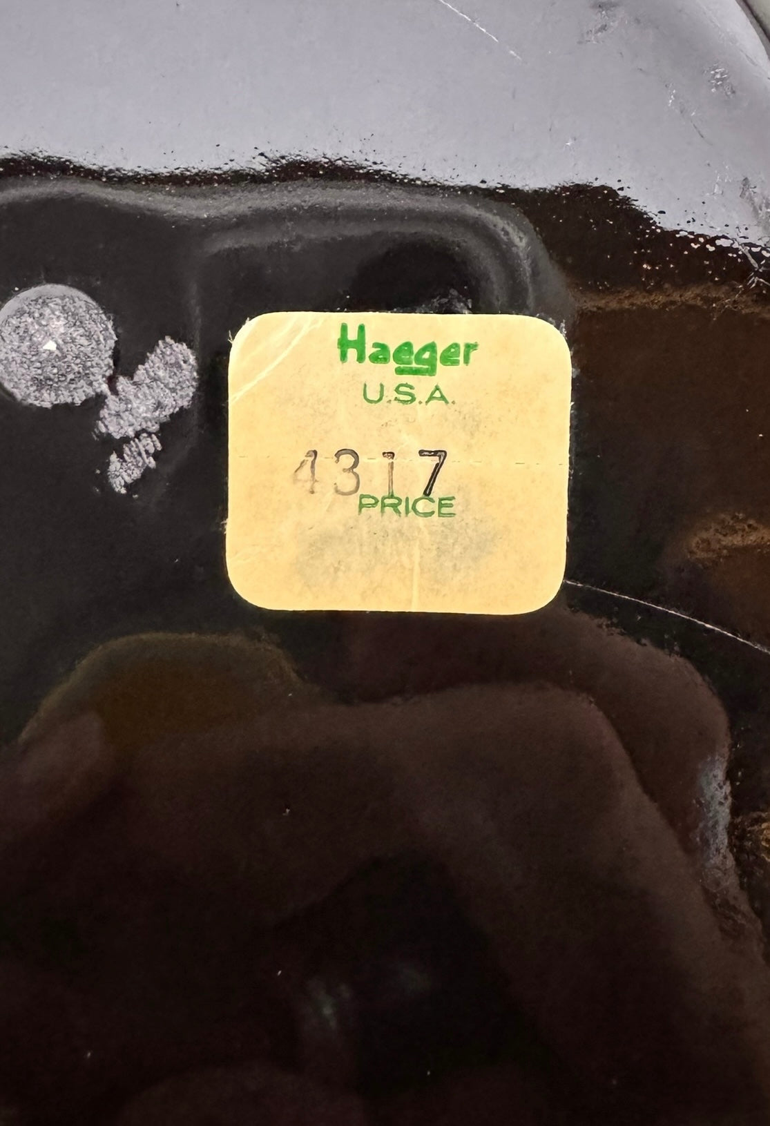 More than just a vessel, this piece stands as a sculptural object, its highly reflective surface playing with ambient light to cast intriguing reflections. The base, revealing areas of natural wear consistent with its age, proudly retains its authentic "Haeger USA" tag, bearing the model number 1317 – a testament to its original catalog identity. The overall wear evident throughout its surface and on its base tells a story of its journey and authenticates its vintage charm, presenting a distinguished patina. Despite its age, the vase remains structurally sound, free from any cracks, ready to grace a curated collection or serve as a striking standalone statement in any modern or contemporary interior. A testament to Haeger's enduring legacy of American ceramic artistry.