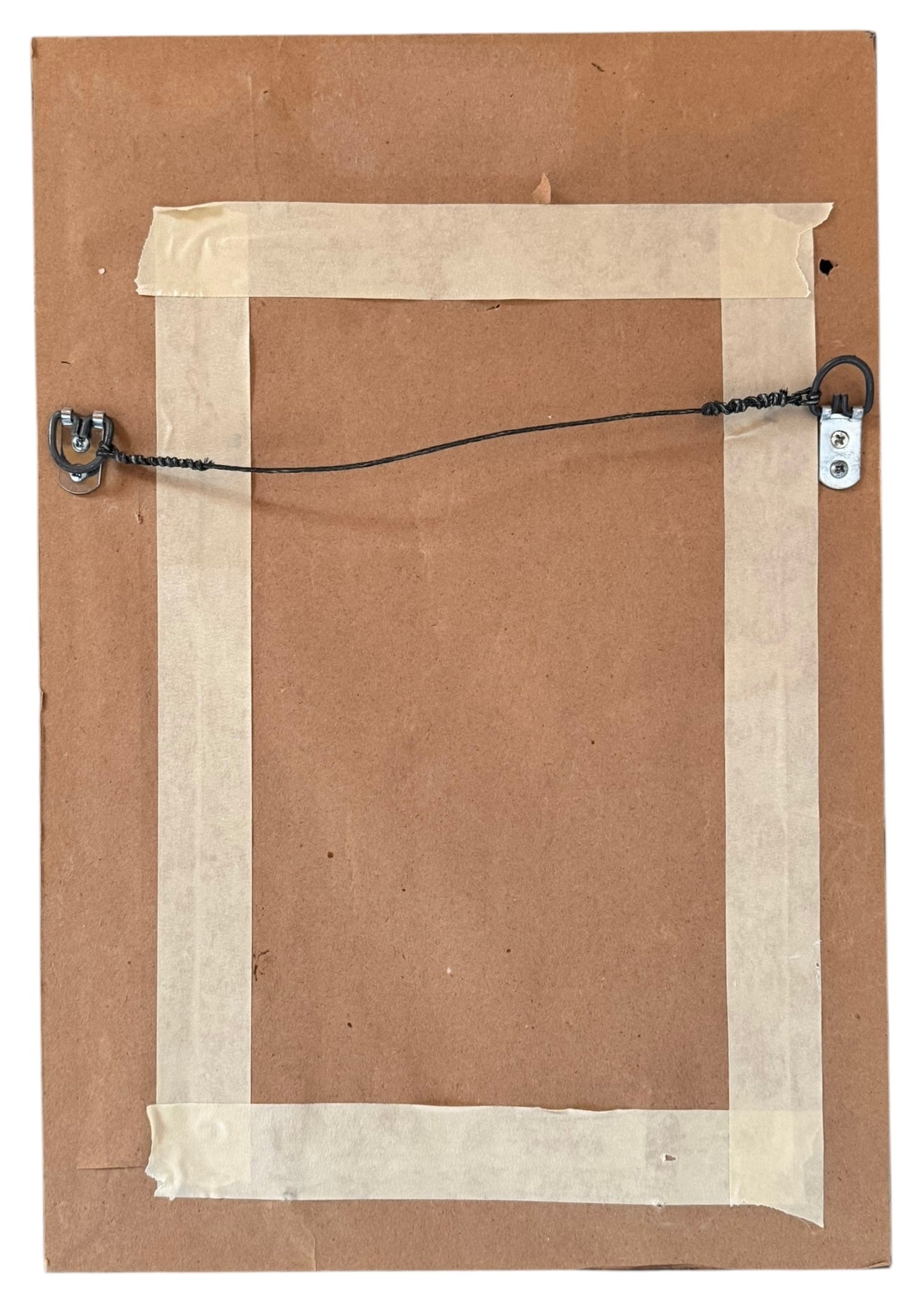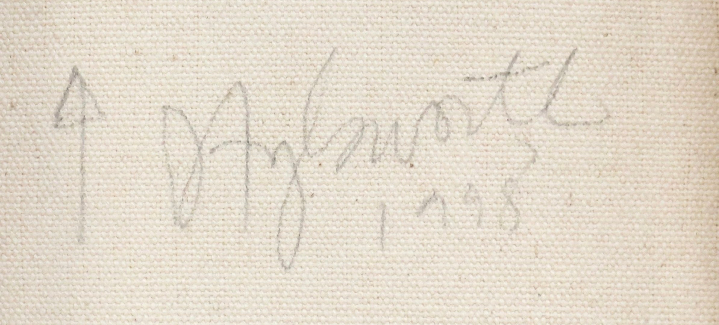 A vibrant example of David Aylsworth’s celebrated "controlled informality," Interfering Friends May Frown captures the artist’s unique ability to balance geometric structure with raw, expressive gesture. Painted in 1998—an era marking Aylsworth’s confident stride into his mature style—this intimate vertical composition serves as a masterclass in color theory and spatial tension, where a rhythmic column of coral and tangerine stripes pushes against cool, atmospheric washes of sky blue and mint green. The forms are purposely imperfect, utilizing thick impasto and visible brushstrokes to reject slick polish in favor of what the artist calls "felt thought," while the central, tombstone-like olive shape and encroaching black bar suggest a narrative of obstruction that subtly echoes the work’s wry title. Based in Houston and an alumnus of the prestigious Core Program, Aylsworth is a defining voice in contemporary American abstraction whose work is held in major permanent collections like the Dallas Museum of Art and the MFAH; this piece, signed on the canvas verso (currently preserved behind the frame’s backing), offers a rare opportunity to acquire a work from his pivotal late-90s period that perfectly encapsulates his reverence for early American Modernism and the intimacy of the Texas abstract movement.
