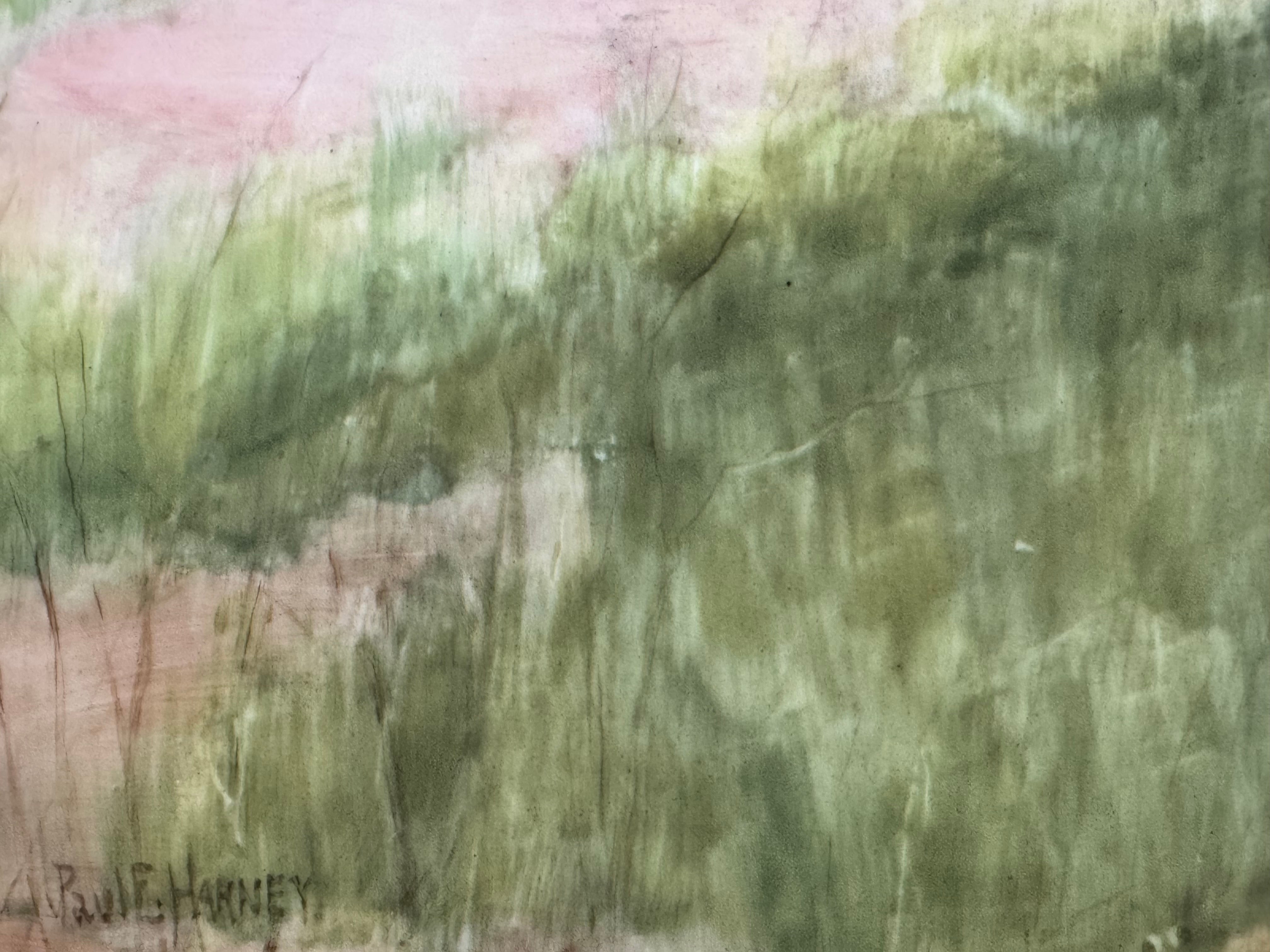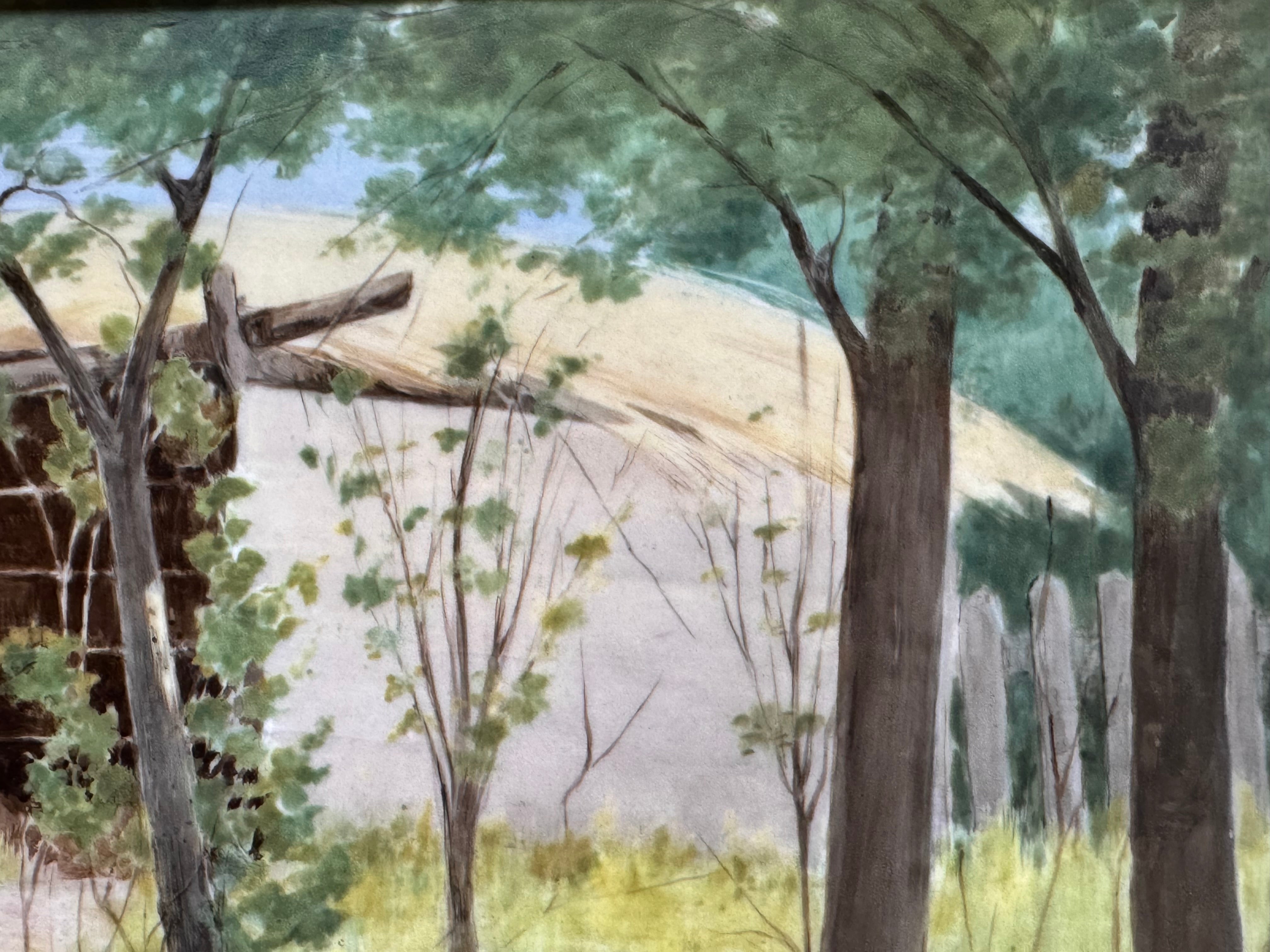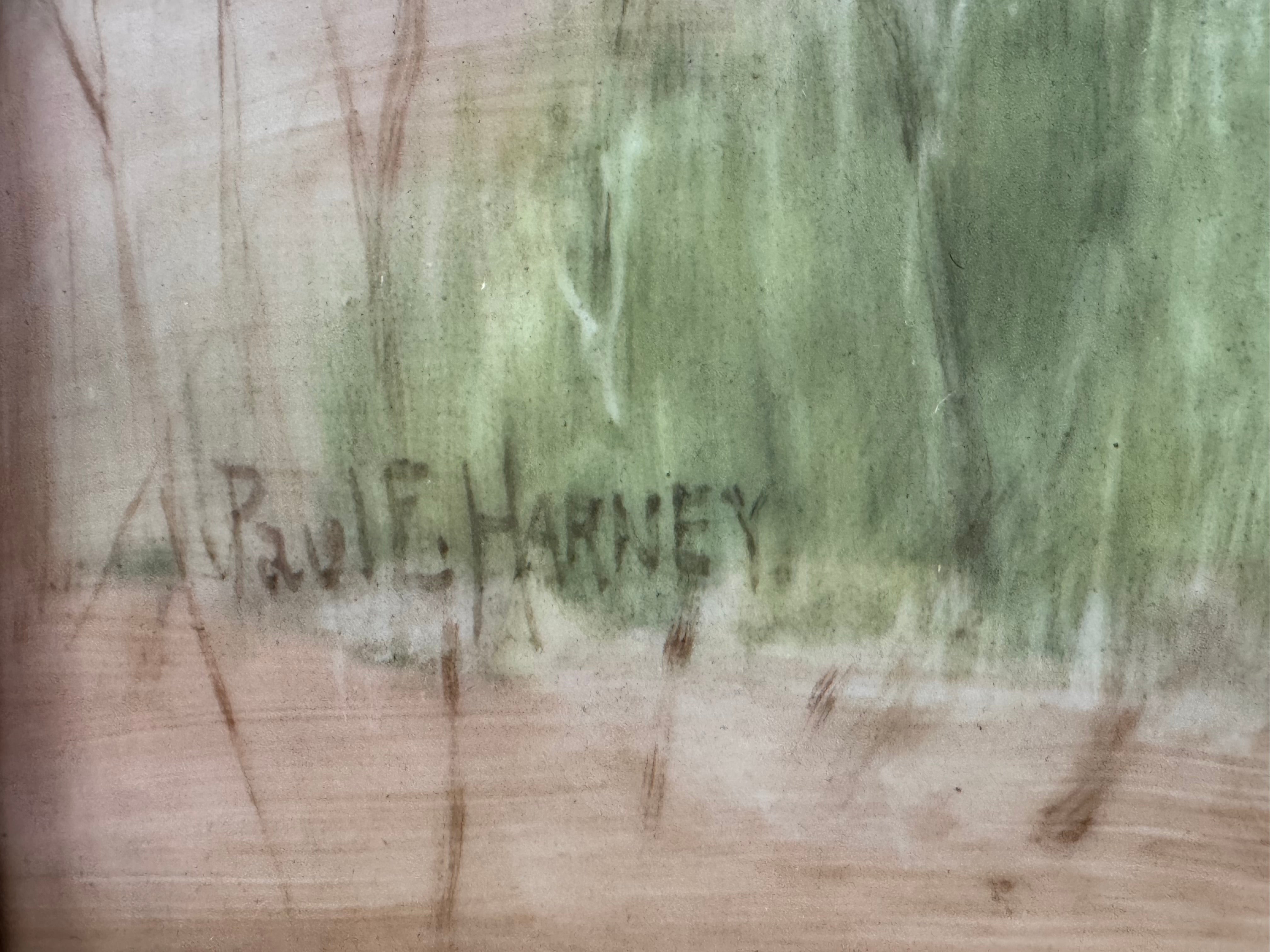 A rare and exquisite example of American genre painting, "Chickens Foraging in a Barnyard" by Paul E. Harney Jr. transforms a humble rural scene into a luminous study. Executed on a KPM porcelain plaque, the non-absorbent surface allows the oil pigment to sit with exceptional clarity and brilliance, creating an inner glow that elevates the subject matter.
