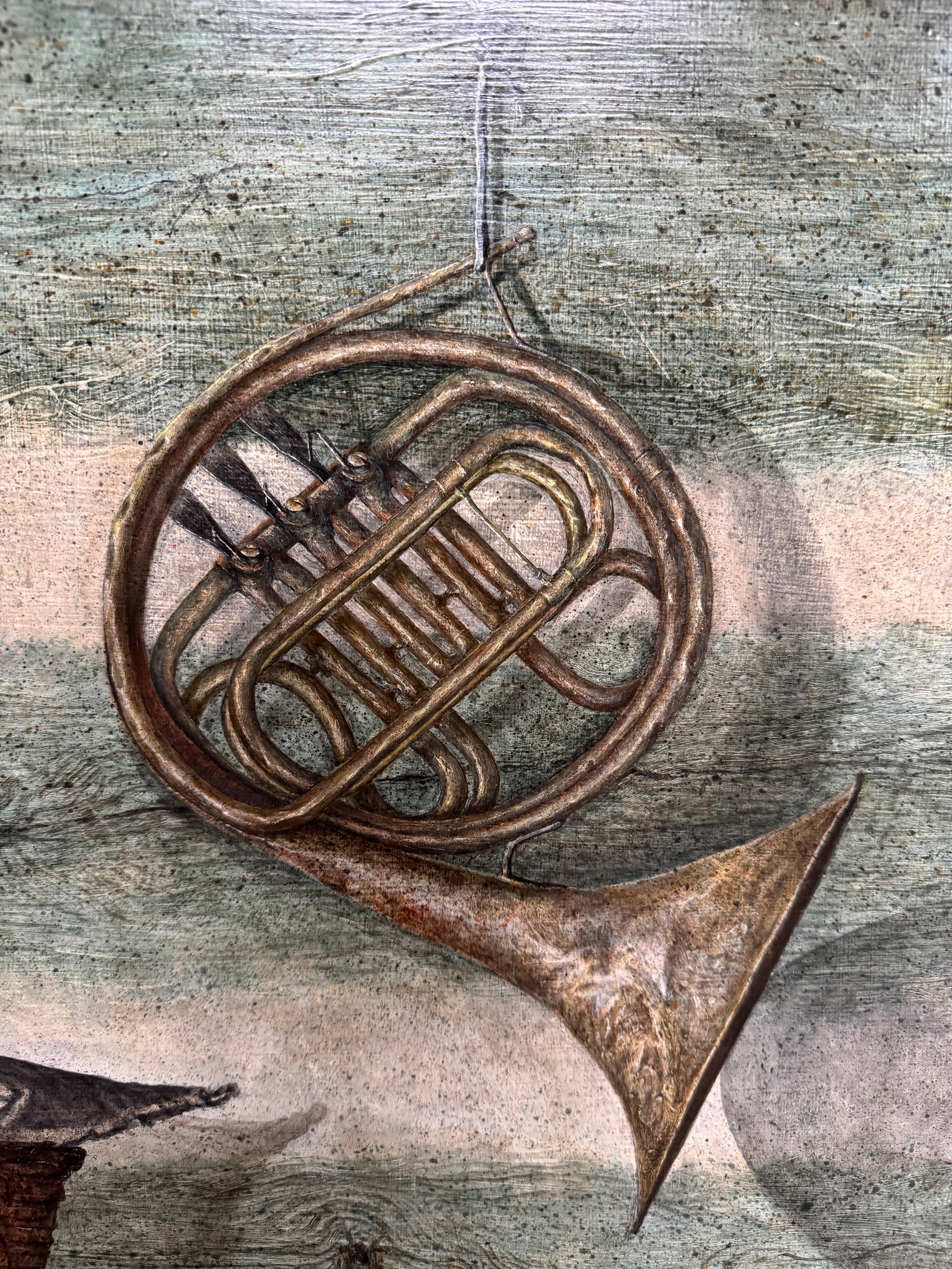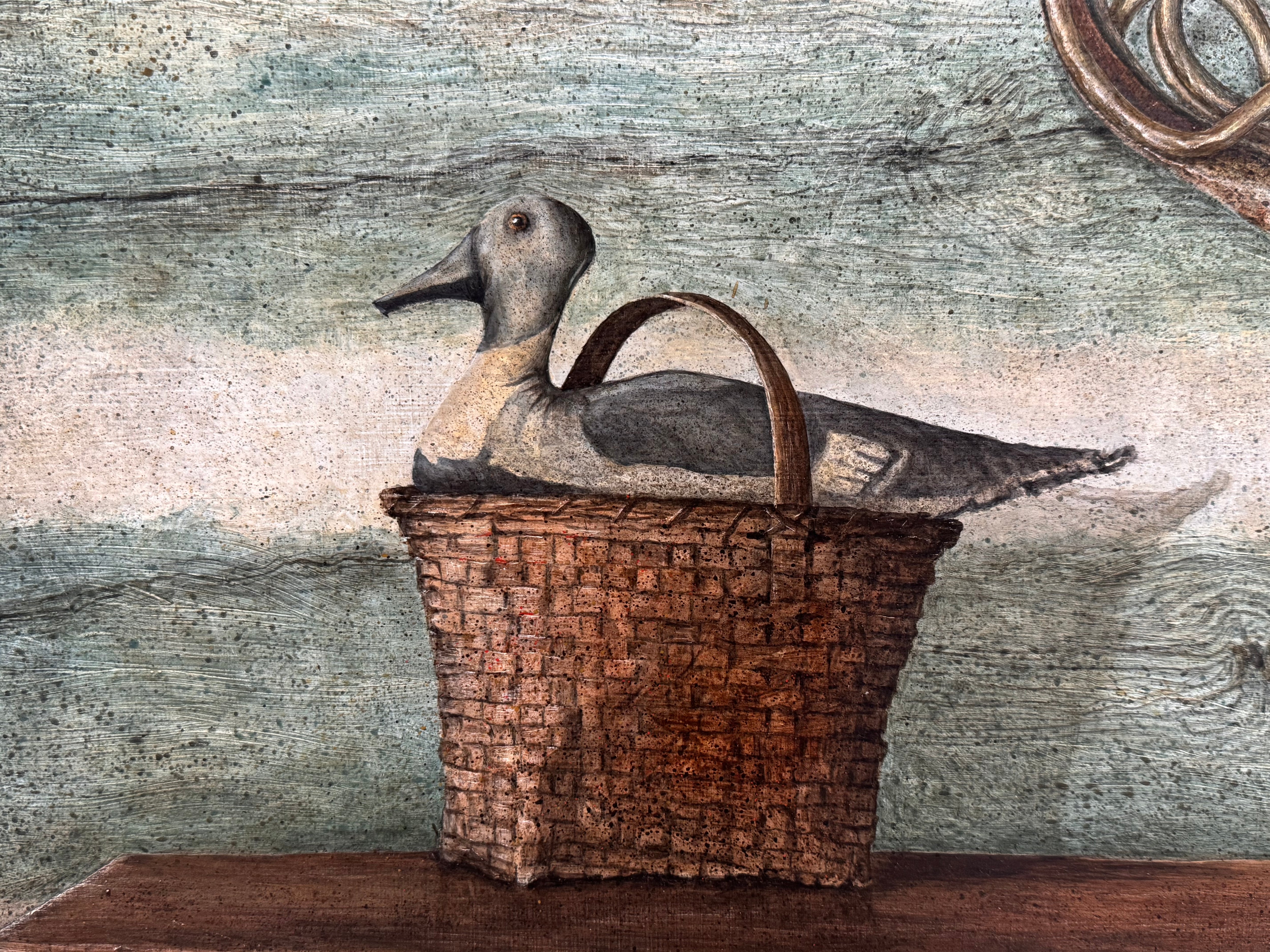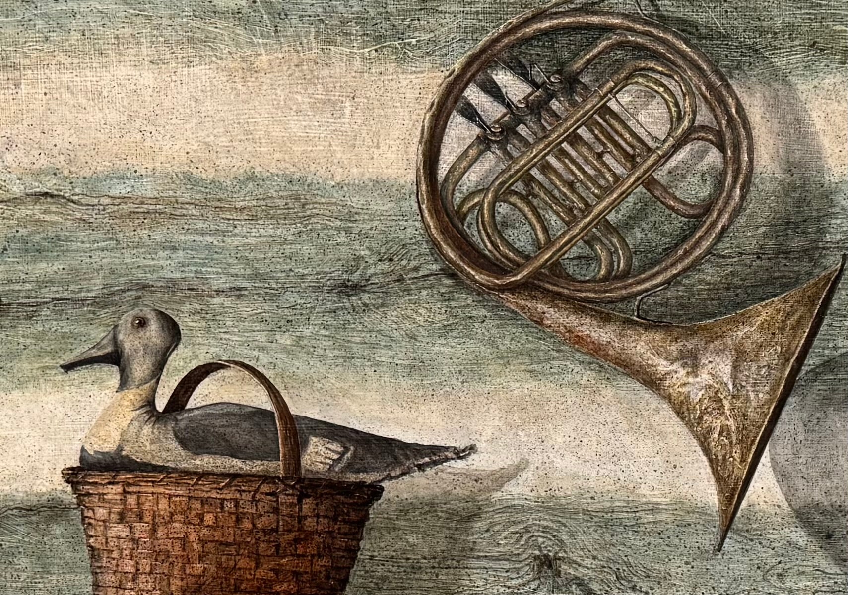 In Canvas Duck, Whitfield constructs a quiet, surreal interior where objects appear deliberately chosen yet emotionally untethered. A duck rests in a woven basket atop a rough wooden table, while a horn floats nearby, detached from any visible source of sound. A window at left admits light without offering a view, reinforcing a sense of pause and unresolved expectation.