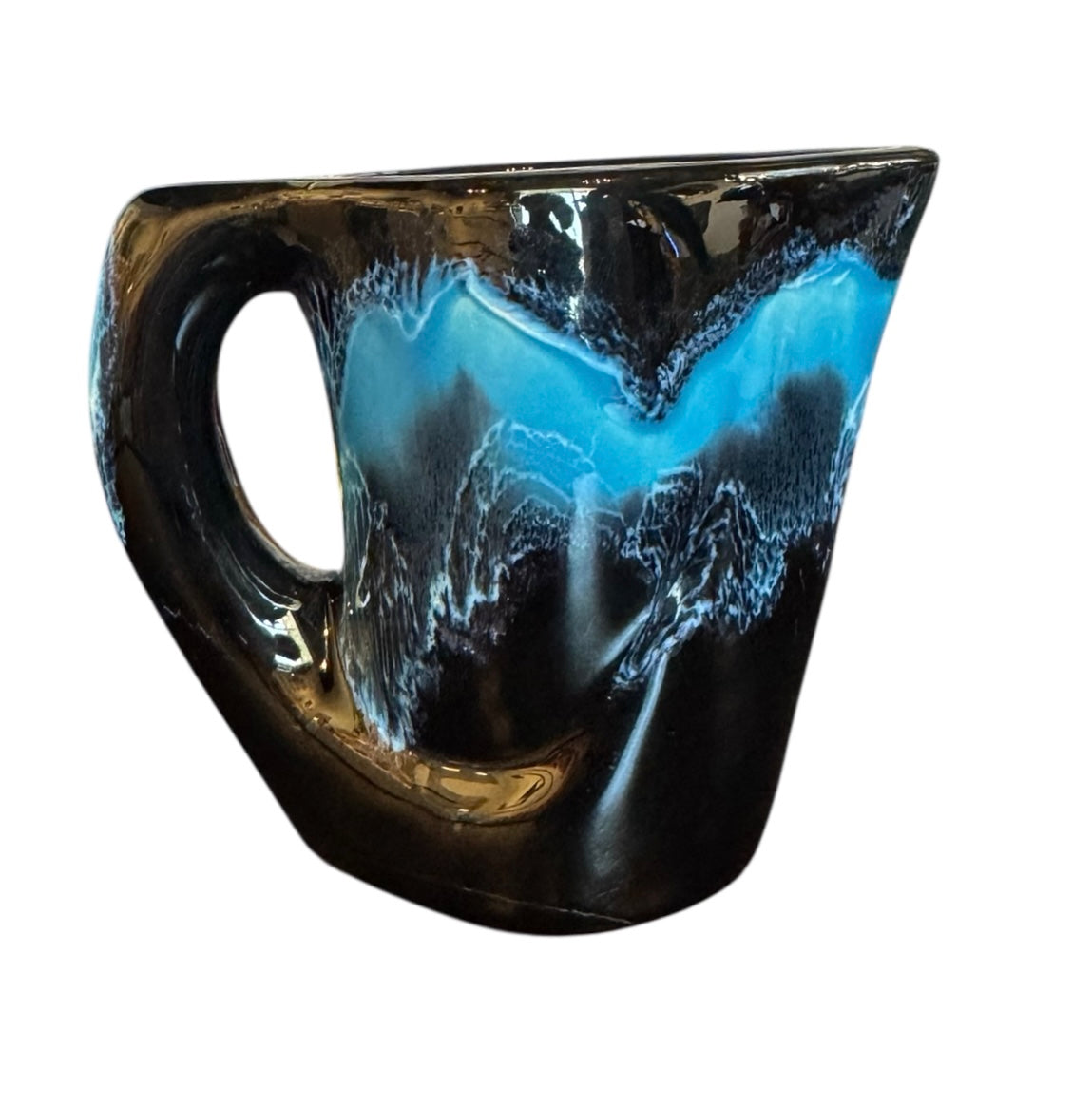 This striking ceramic tea set presents a compelling example of mid-century design, echoing the experimental spirit of the Vallauris pottery movement. The set is distinguished by its dramatic glaze, a deliberate "lava drip" effect rendered in a high-contrast palette of blue and black. This dynamic interplay of color and texture creates a visual tension that is both bold and refined, showcasing the influence of Vallauris. The forms themselves, from the angular teapot to the sculptural cups and saucers, speak to a design sensibility that embraces asymmetry and expressive contours. While the set bears no maker's mark, it is a compelling study in mid-century ceramic aesthetics, revealing a dedication to both innovative glazing techniques and distinctive, unconventional forms. The wear to the bases adds a subtle layer of history, hinting at the set's past use and enjoyment.